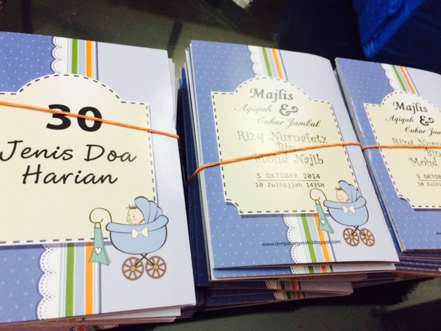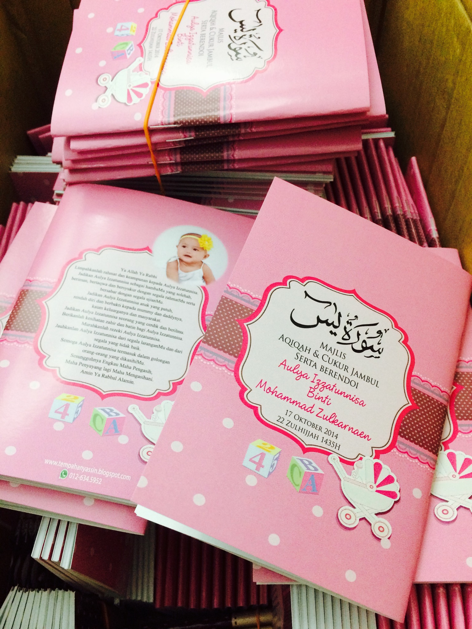 Untuk tempahan yassin, doorgift aqiqah, tempahan buku doa, tempahan stiker boleh whatsapp sy di 0126345952 or pm di facebook pages d sebelah kanan ni.. Kami sedia membantu anda 🙂
