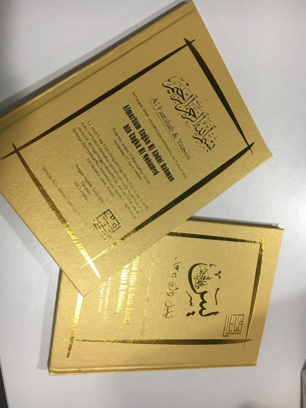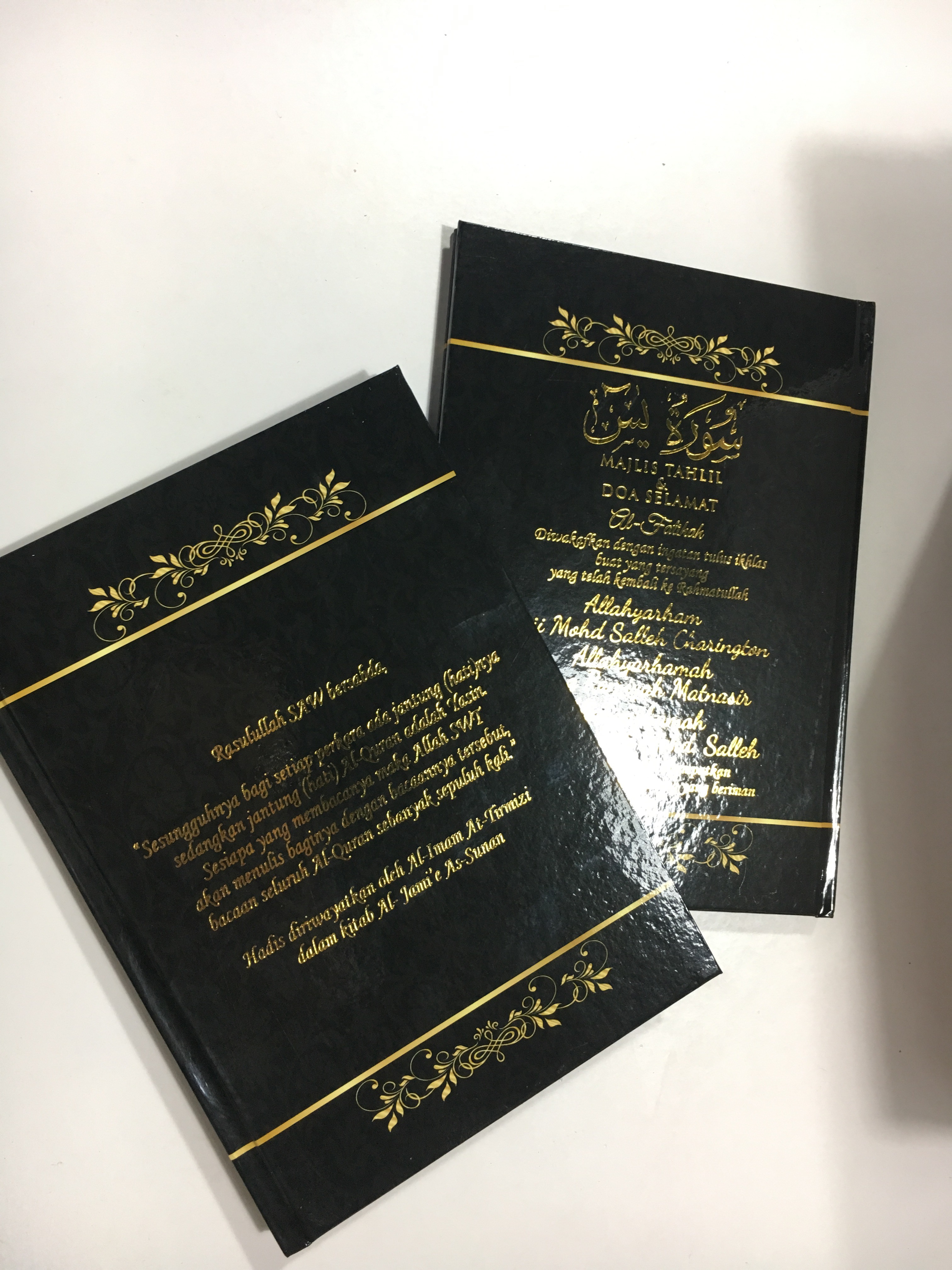 Untuk tempahan buku yasin custom, anda boleh lah whatsapp kami di 0192520041 ataupun terus ke kedai kami di TS70 pasar besar gombak,53000 kuala lumpur.
