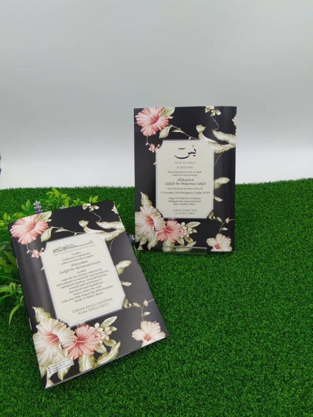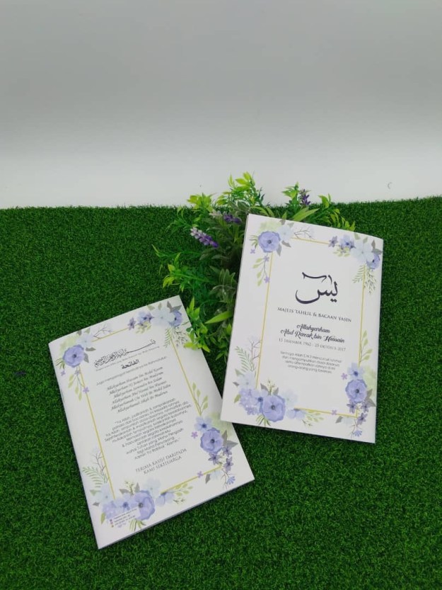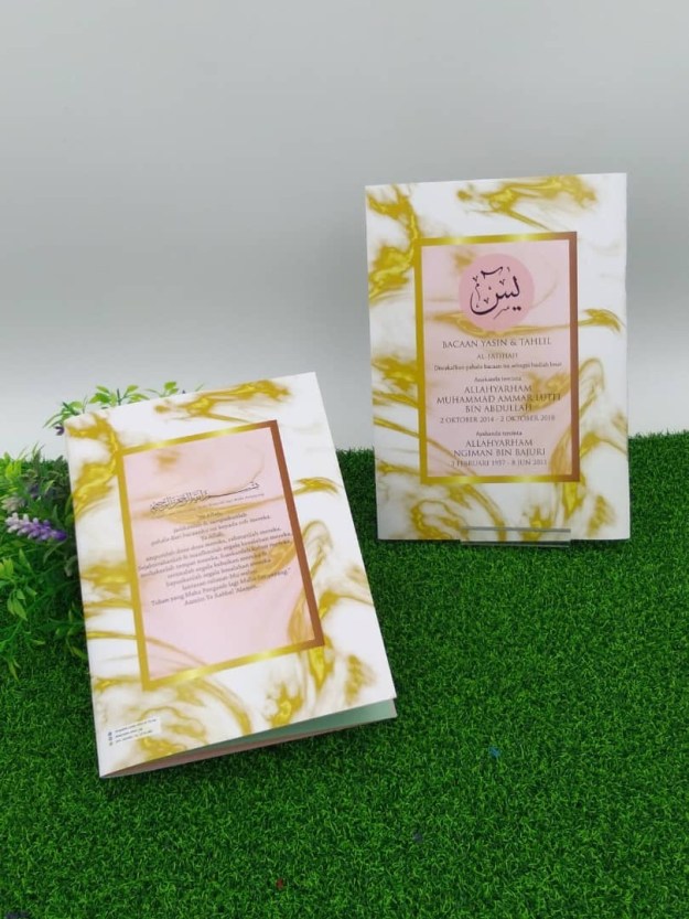 Apakah maksud custom made? Maksudnya kami print terus nama dan wording pilihan anda terus di cover buku yasin. Buku yasin custom tu akan nampak menarik dan ekslusif. Tetamu yang hadir ke majlis kesyukuran, majlis tahlil boleh terus bawa balik buku yasin tersebut sebagai simpanan peribadi mereka. Ia secara tak lamgsung dpt dijadikan doorgift kepada tetamu yang hadir.