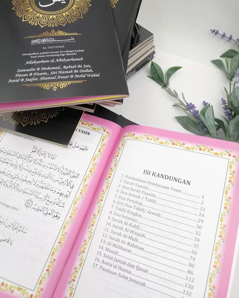 Kami berharap agar anda berpuas hati dengan servis yang tempahan yasin custom cover berikan. Buku yasin custom kami dilengkapi dengan Surah Yasin, Surah Al-Kahfi, Surah Al-Waqiah, Surah Al-Mulk, Surah Ar-Rahman, Al-Mathurat, Manzil, Asma’ul Husna, Solat Jenazah, Panduan Solat Jenazah dan pelbagai lagi content yang bermanfaat buat amalan harian anda.