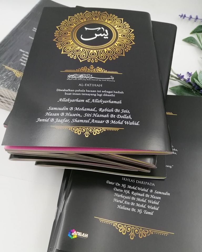 Untuk tempahan buku yasin custom, anda boleh terus click di sini atau whatsapp kami di 0192520041, atau terus ke showroom kami dengan waze: Angah Doorgift And Printing Sdn Bhd.