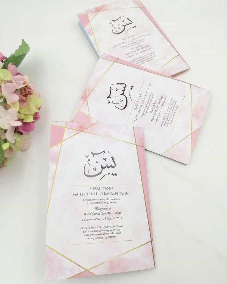 Kami berharap agar anda berpuas hati dengan servis yang tempahan yasin custom cover berikan. Buku yasin custom kami dilengkapi dengan Surah Yasin, Surah Al-Kahfi, Surah Al-Waqiah, Surah Al-Mulk, Surah Ar-Rahman, Al-Mathurat, Manzil, Asma’ul Husna, Solat Jenazah, Panduan Solat Jenazah dan pelbagai lagi content yang bermanfaat buat amalan harian anda. Kami mempunyai lebih 500 pilihan design yang pasti akan memuaskan hati anda semua.
