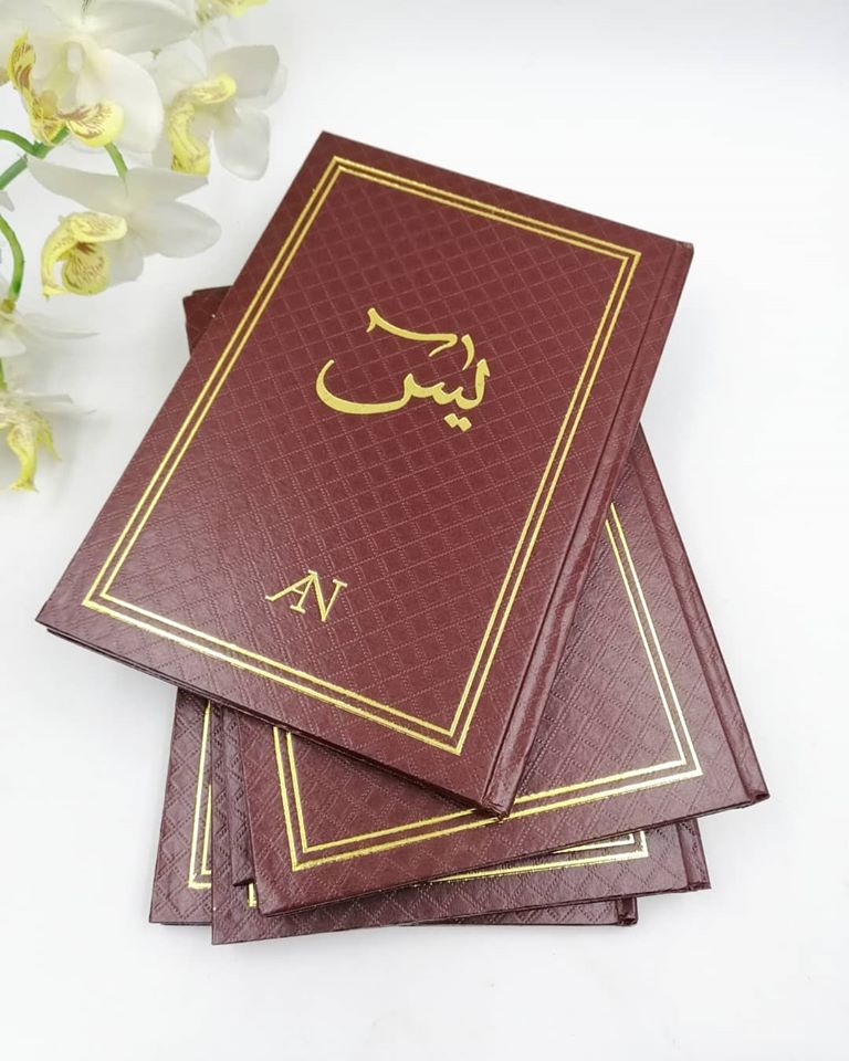 Buku Yasin Hardcover mempunyai wording Hot Stamping Gold / Silver. Sudah semestinya cover buku yasin ini kami print wording nama terus di cover buku yasin. Minimum order 50 pcs dan ke atas. Buku Yasin Hardcover sesuai untuk dijadikan doorgift untuk majlis Aqiqah, Majlis Kesyukuran, majlis pernikahan, majlis tahlil dan majlis bacaan yasin.