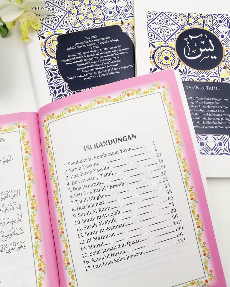 Kami berharap agar anda berpuas hati dengan servis yang tempahan yasin custom cover berikan. Buku yasin custom kami dilengkapi dengan Surah Yasin, Surah Al-Kahfi, Surah Al-Waqiah, Surah Al-Mulk, Surah Ar-Rahman, Al-Mathurat, Manzil, Asma’ul Husna, Solat Jenazah, Panduan Solat Jenazah dan pelbagai lagi content yang bermanfaat buat amalan harian anda. Kami mempunyai lebih 500 pilihan design yang pasti akan memuaskan hati anda semua.
