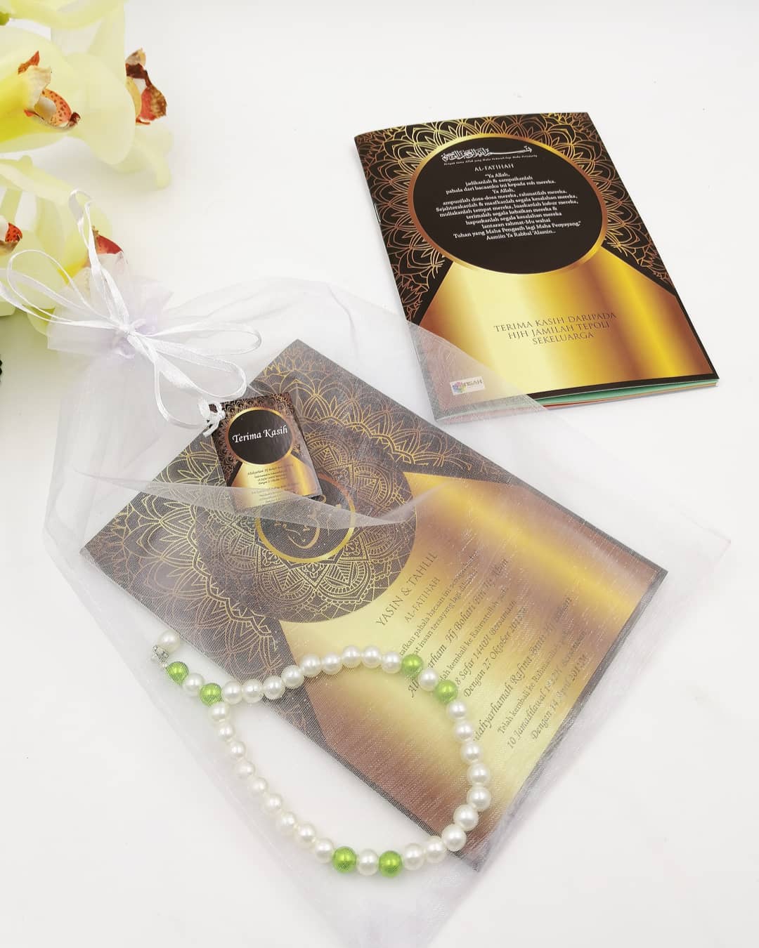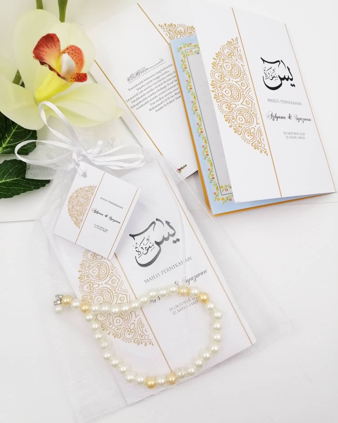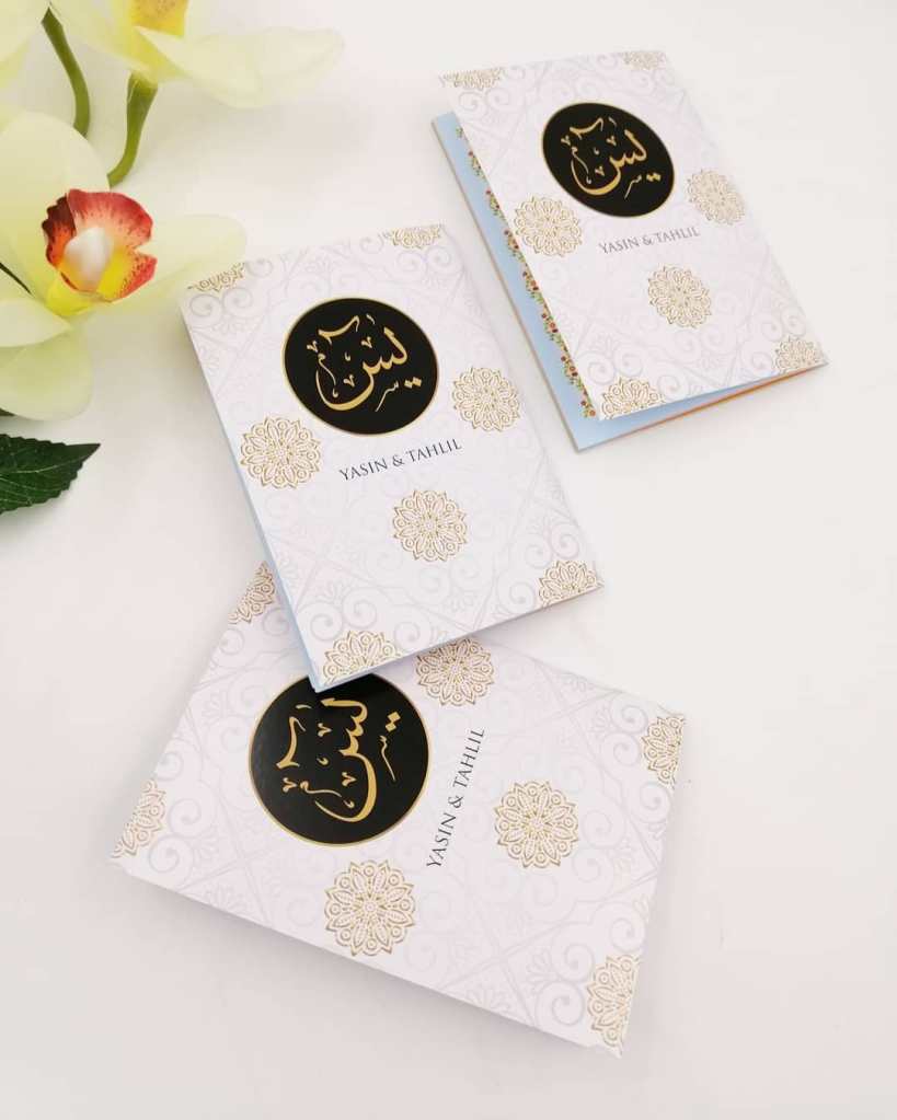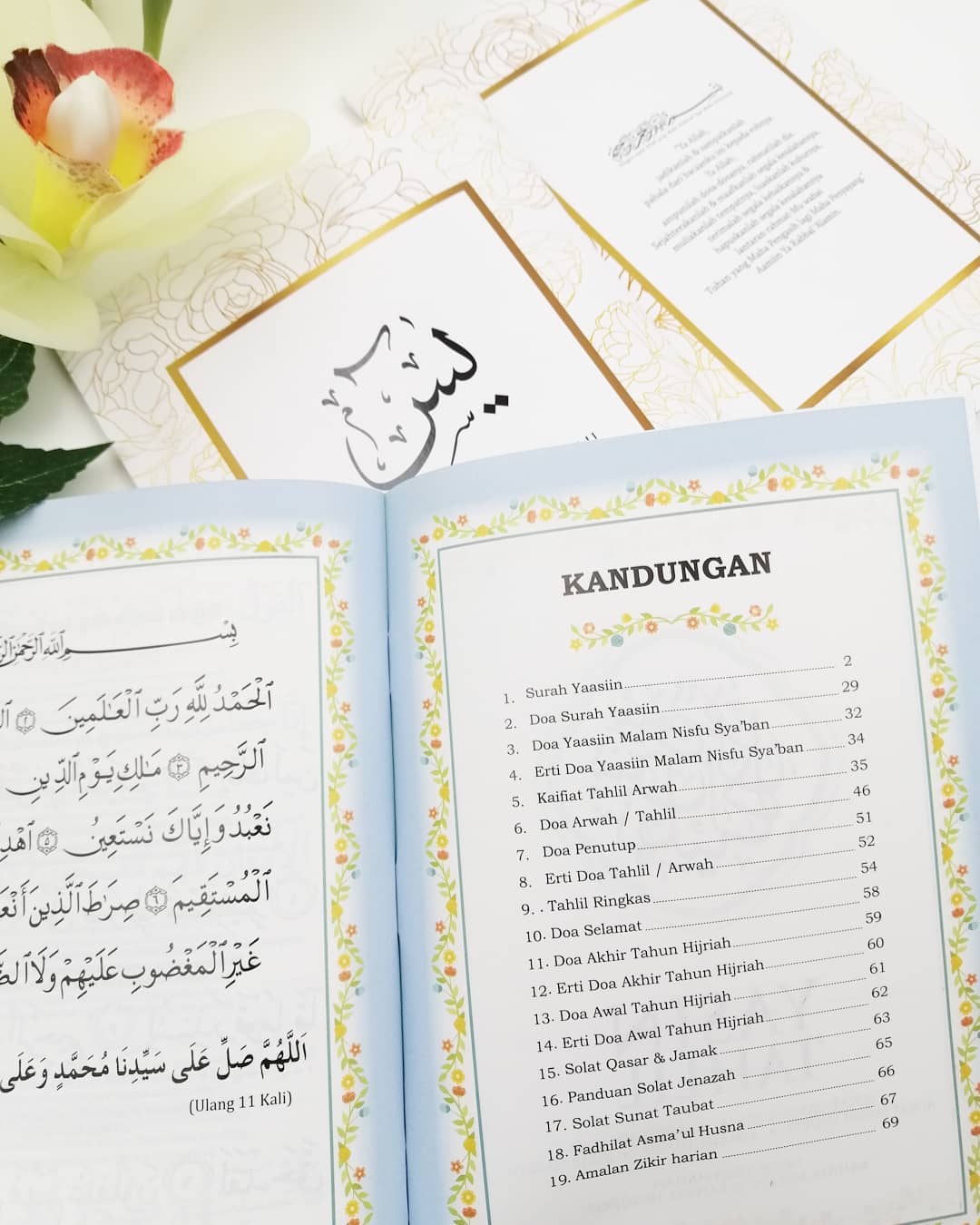 Kalau dah buat majlis perkahwinan, majlis aqiqah, majlis kesyukuran, majlis cukur jambul takkan nak beri doorgift biasa-biasa kan? Mestilah nak yang cantik & berkat supaya majlis pun berjalan dengan lancar DAN yang paling penting tetamu tak buang-buang doorgift tu kan 😉 Tempahan yassin, stiker & TQ tag ada menyediakan yasin untuk dijadikan doorgift ketika majlis anda. Apa yang lagi Istimewa? Terdapat 2 jenis Buku Yasin berserta tafsir Bahasa Melayu/English sebagai rujukan. Terdapat lebih 300 design untuk dipilih. Isi kandungan buku yasin berwarna. ‘Font’ nama dan perkataan mengikut kehendak anda. Yasin ada size besar dan sederhana. Layout yang kemas dengan tulisan yang jelas. Terdapat Tahlil, Doa Arwah, Doa Selamat, Doa Penutup, Asmaul Husna, Zikir Hardan dan lain-lain.
