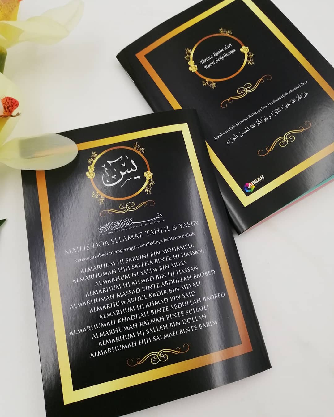 Untuk tempahan buku yasin custom, anda boleh terus click di sini or whatsapp kami 0192520041, atau terus ke showroom kami dengan waze: Angah Doorgift And Printing Sdn Bhd