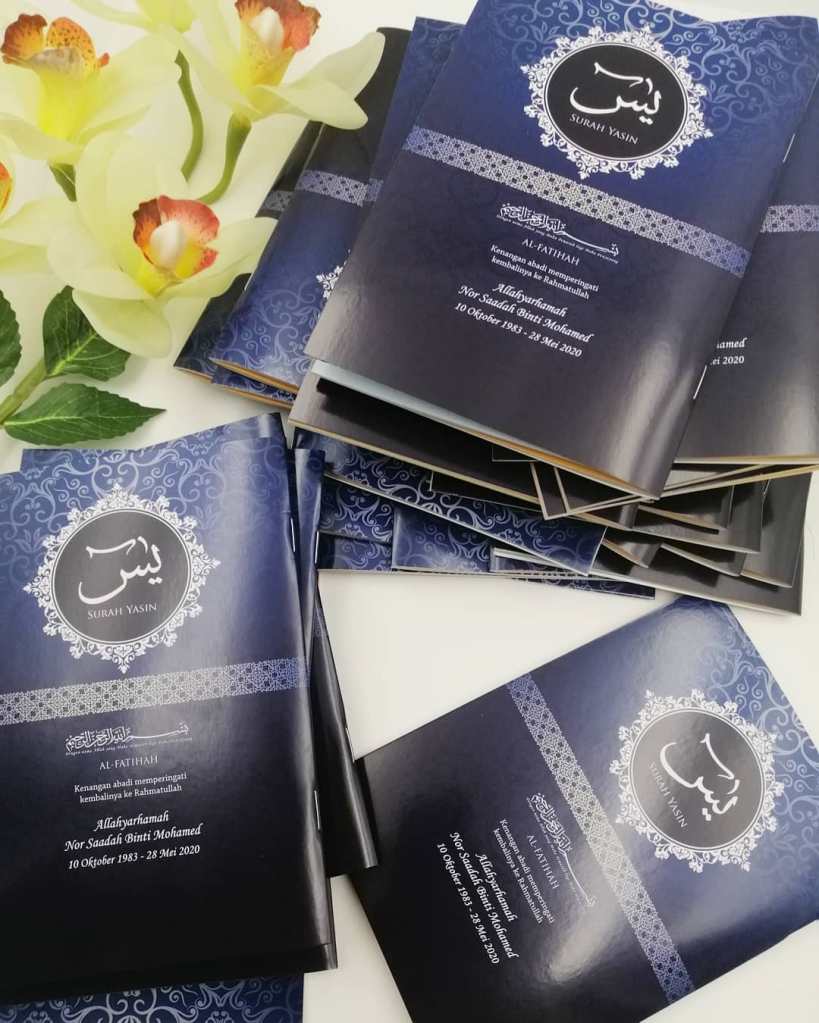 Kami berharap agar anda berpuas hati dengan servis yang tempahan yasin custom cover berikan. Buku yasin custom kami dilengkapi dengan Surah Yasin, Doa Yasin, Tahlil Ringkas, Doa Selamat, Doa Akhir Tahun Hijriah, Doa Awal Tahun Hijriah, Amalan Zikir Harian, Solat Jamak, Solat Qasar, Asma’ul Husna, Panduan Solat Jenazan dan pelbagai lagi content yang bermanfaat buat anda. Kami mempunyai lebih 500 pilihan design yang pasti akan memuaskan hati anda semua.