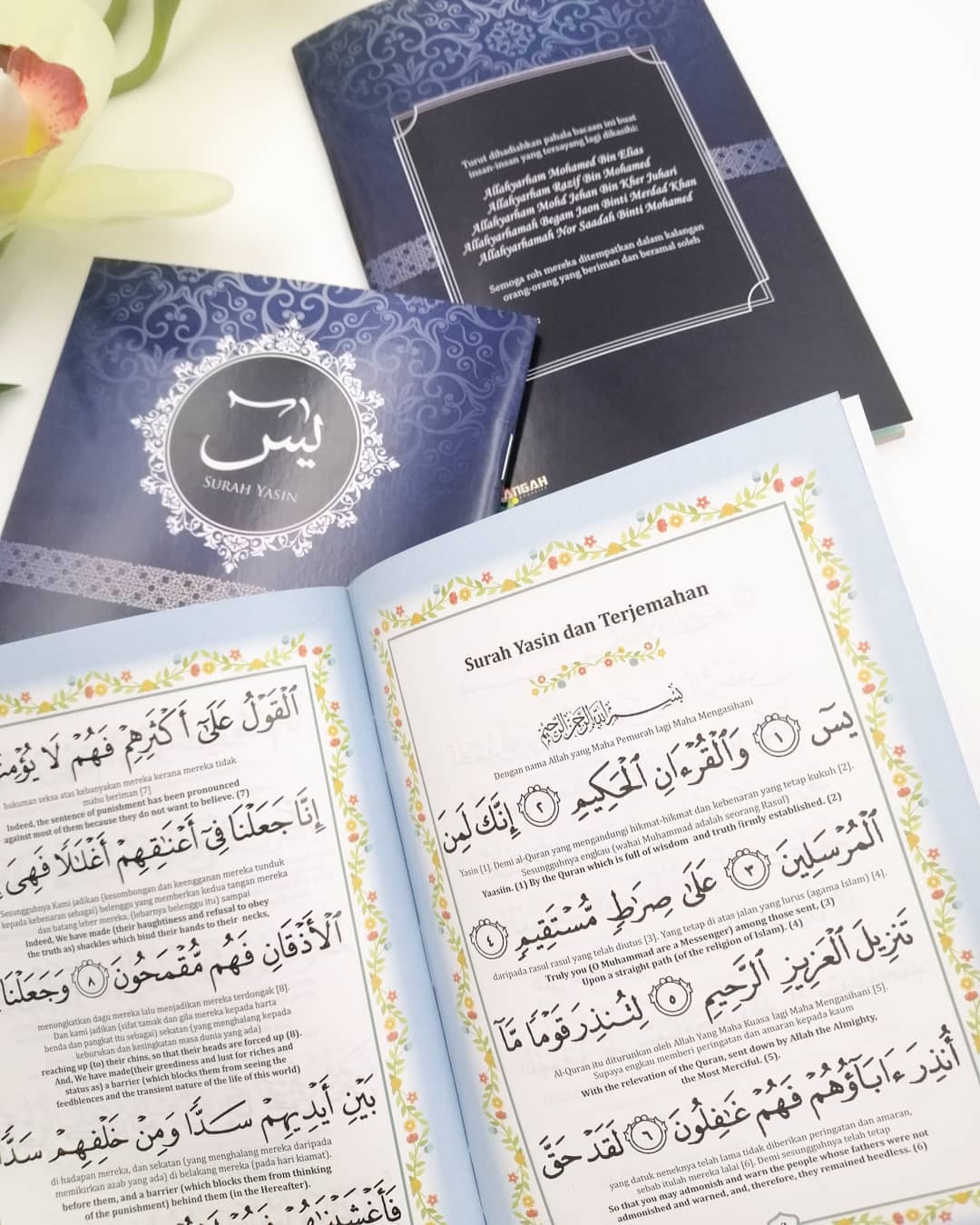 Kami berharap agar anda berpuas hati dengan servis yang tempahan yasin custom cover berikan. Buku yasin custom kami dilengkapi dengan Surah Yasin, Doa Yasin, Tahlil Ringkas, Doa Selamat, Doa Akhir Tahun Hijriah, Doa Awal Tahun Hijriah, Amalan Zikir Harian, Solat Jamak, Solat Qasar, Asma’ul Husna, Panduan Solat Jenazan dan pelbagai lagi content yang bermanfaat buat anda. Kami mempunyai lebih 500 pilihan design yang pasti akan memuaskan hati anda semua.