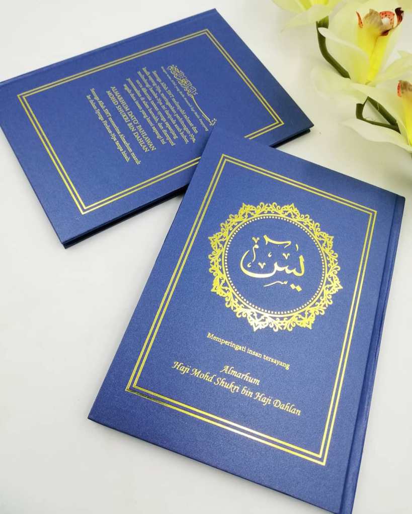 Untuk tempahan buku yasin custom, anda boleh terus click di sini atau whatsapp kami di 0192520041, atau terus ke showroom kami dengan waze: Angah Doorgift And Printing Sdn Bhd.