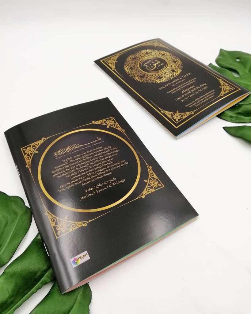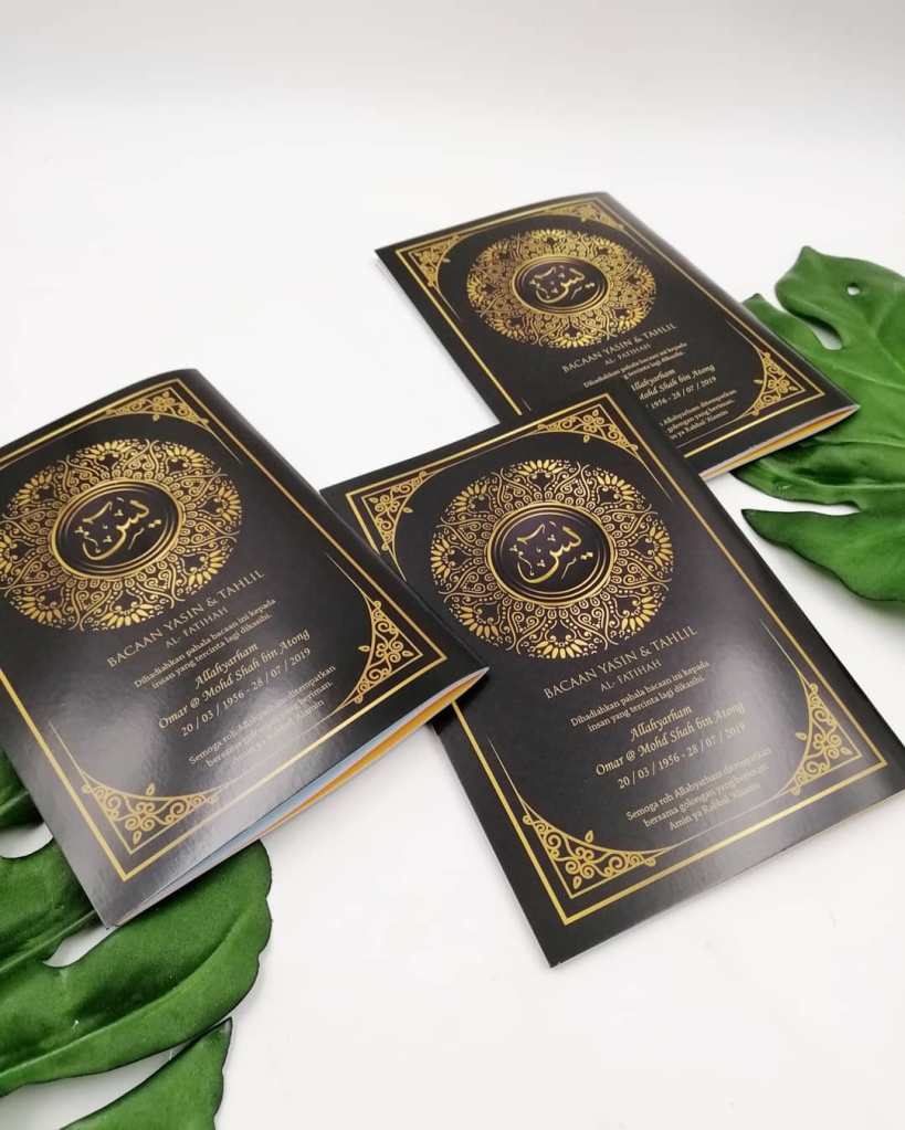 Kami berharap agar anda berpuas hati dengan servis yang tempahan yasin custom cover berikan. Buku yasin custom kami dilengkapi dengan Surah Yasin, Doa Yasin, Tahlil Ringkas, Doa Selamat, Doa Akhir Tahun Hijriah, Doa Awal Tahun Hijriah, Amalan Zikir Harian, Solat Jamak, Solat Qasar, Asma’ul Husna, Panduan Solat Jenazan dan pelbagai lagi content yang bermanfaat buat anda. Kami mempunyai lebih 500 pilihan design yang pasti akan memuaskan hati anda semua.