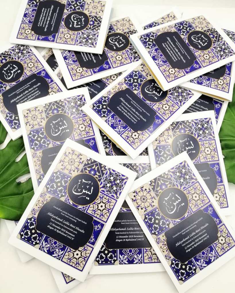 Buku yasin custom kami mengunakan cover artcard dan mempunyai 136 muka surat. Cover buku yasin kami custom dengan nama dan wording yang anda pilih serta mempunyai lebih dari 500 design untuk anda membuat pilihan. Kami jugak mengambil tempahan urgent untuk anda yang memerlukan dengan kadar segera.
