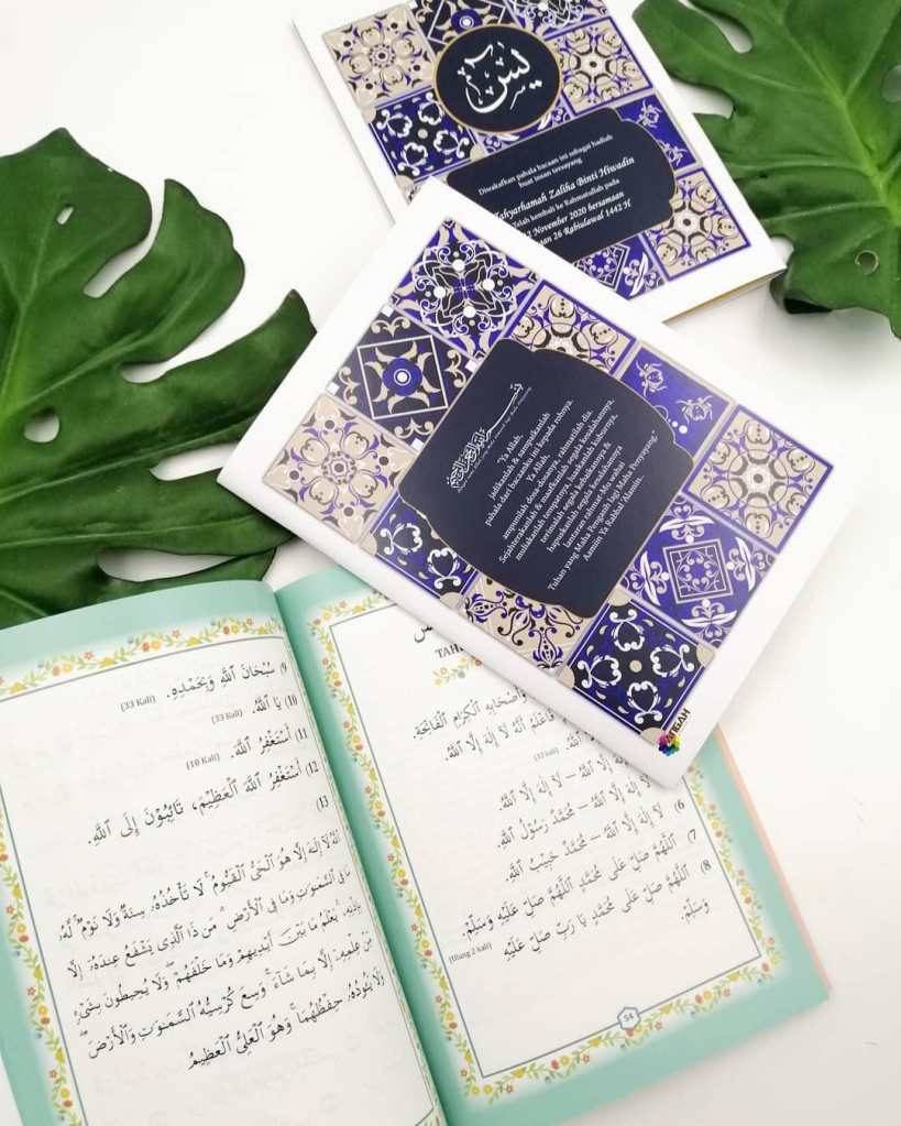 Untuk tempahan buku yasin custom, anda boleh terus click di sini or whatsapp kami 0192520041, atau terus ke showroom kami dengan waze: Angah Doorgift And Printing Sdn Bhd.