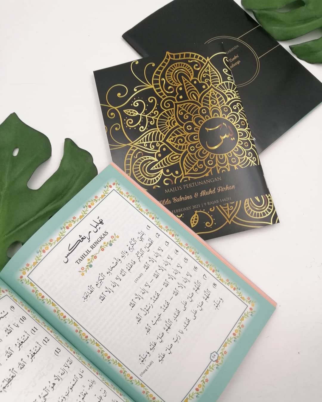 Buku yasin custom kami mengunakan cover artcard dan mempunyai 136 muka surat. Cover buku yasin kami custom dengan nama dan wording yang anda pilih serta mempunyai lebih dari 500 design untuk anda membuat pilihan. Kami jugak mengambil tempahan urgent untuk anda yang memerlukan dengan kadar segera.