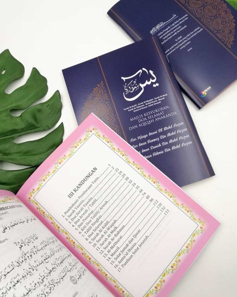 Untuk tempahan buku yasin custom, anda boleh terus click di sini atau whatsapp kami di 0192520041, atau terus ke showroom kami dengan waze: Angah Doorgift And Printing Sdn Bhd.