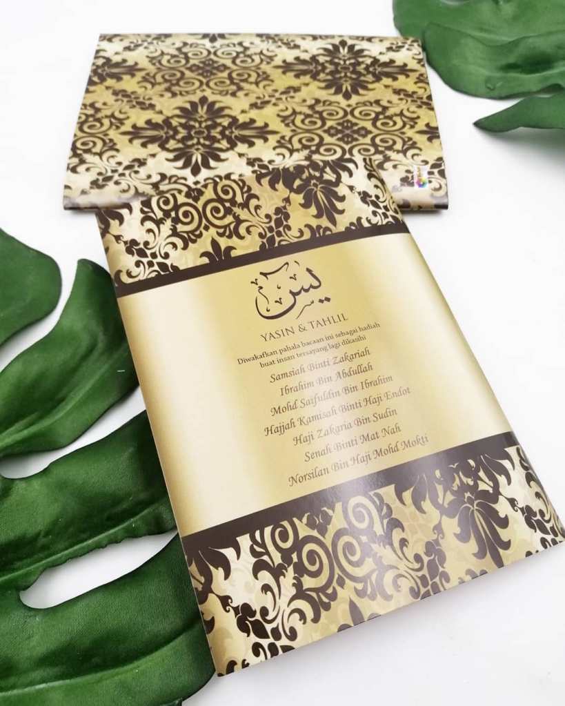 Untuk tempahan buku yasin custom, anda boleh terus click di sini atau whatsapp kami di 0192520041, atau terus ke showroom kami dengan waze: Angah Doorgift And Printing Sdn Bhd.
