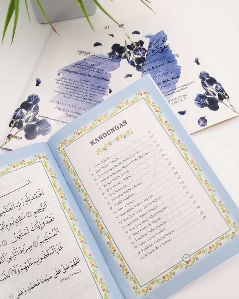 Kami berharap agar anda berpuas hati dengan servis yang tempahan yasin custom cover berikan. Buku yasin custom kami dilengkapi dengan Surah Yasin, Doa Yasin, Tahlil Ringkas, Doa Selamat, Doa Akhir Tahun Hijriah, Doa Awal Tahun Hijriah, Amalan Zikir Harian, Solat Jamak, Solat Qasar, Asma’ul Husna, Panduan Solat Jenazan dan pelbagai lagi content yang bermanfaat buat anda. Kami mempunyai lebih 500 pilihan design yang pasti akan memuaskan hati anda semua.
