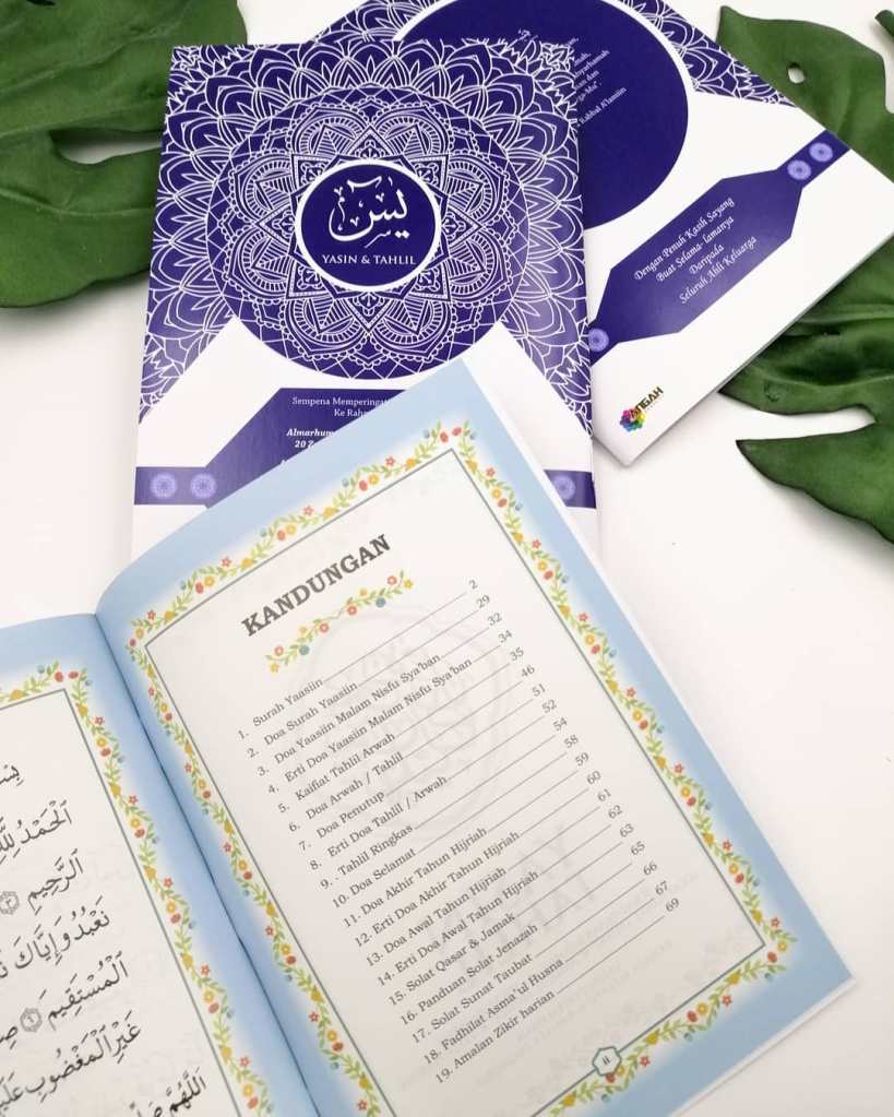 Untuk tempahan buku yasin custom, anda boleh terus click di sini or whatsapp kami 0192520041, atau terus ke showroom kami dengan waze: Angah Doorgift And Printing Sdn Bhd