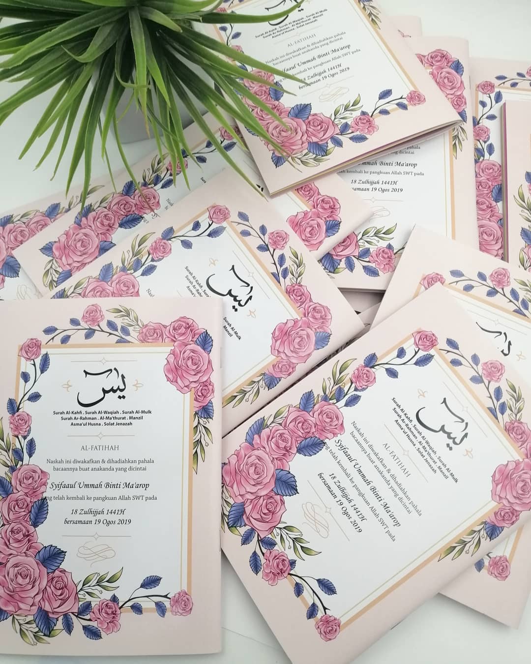 Buku yasin custom kami mengunakan cover artcard dan mempunyai 136 muka surat. Cover buku yasin kami custom dengan nama dan wording yang anda pilih serta mempunyai lebih dari 500 design untuk anda membuat pilihan. Kami jugak mengambil tempahan urgent untuk anda yang memerlukan dengan kadar segera.