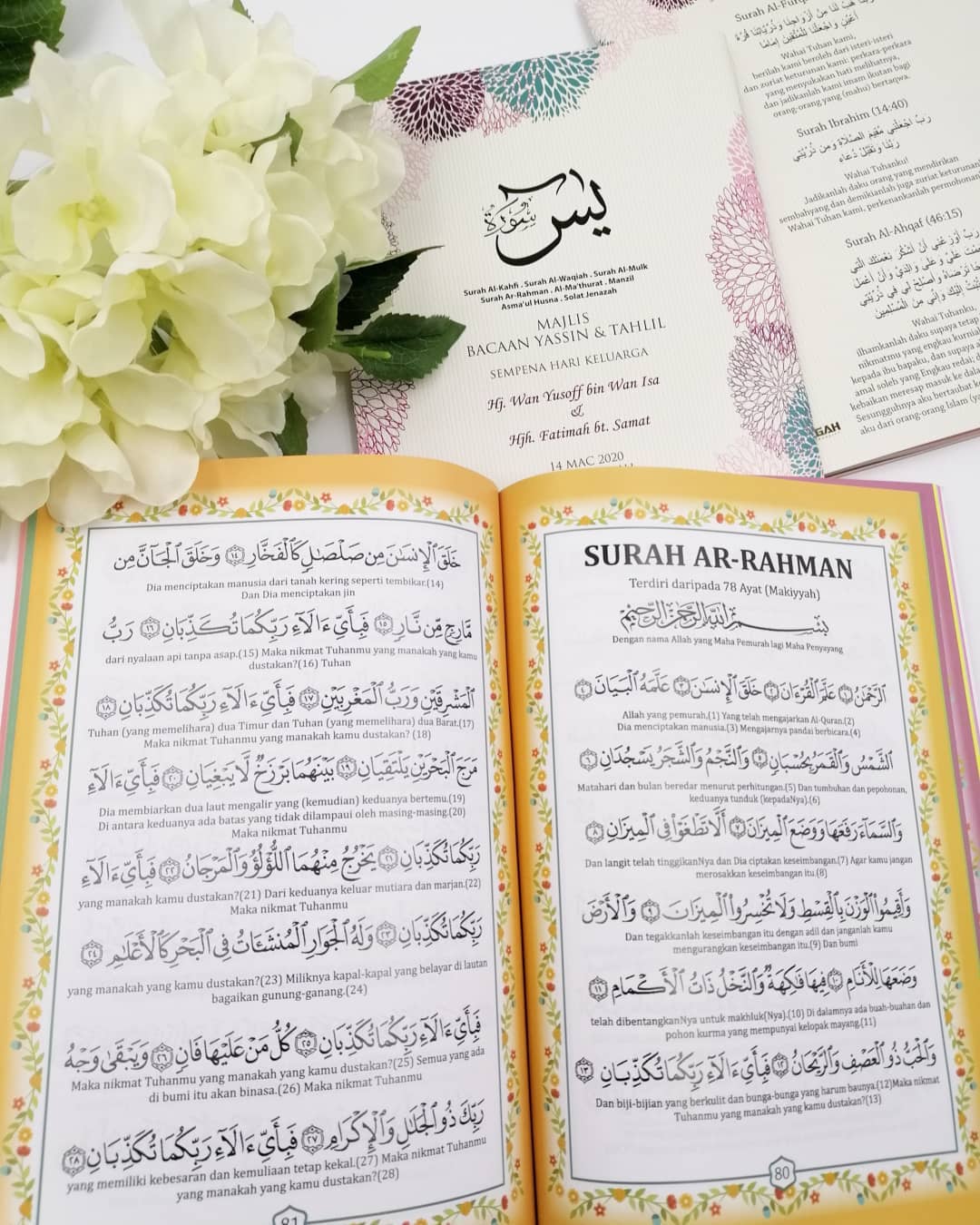 Untuk tempahan buku yasin custom, anda boleh terus click di sini atau whatsapp kami di 0192520041, atau terus ke showroom kami dengan waze: Angah Doorgift And Printing Sdn Bhd.