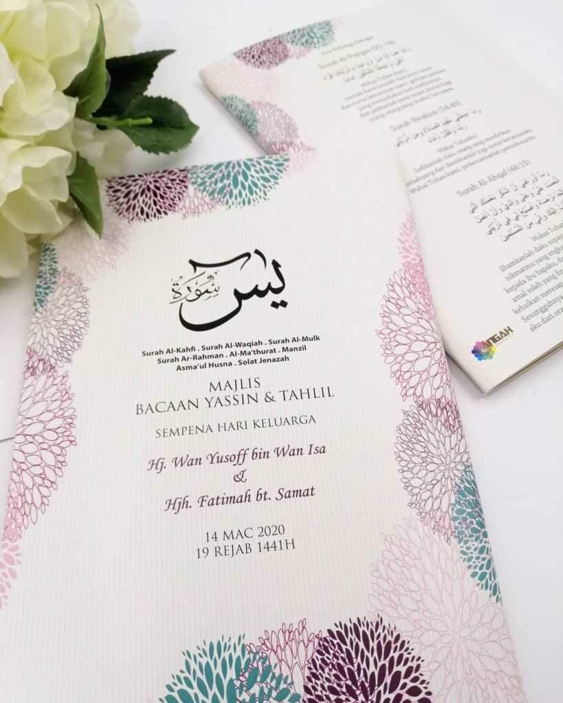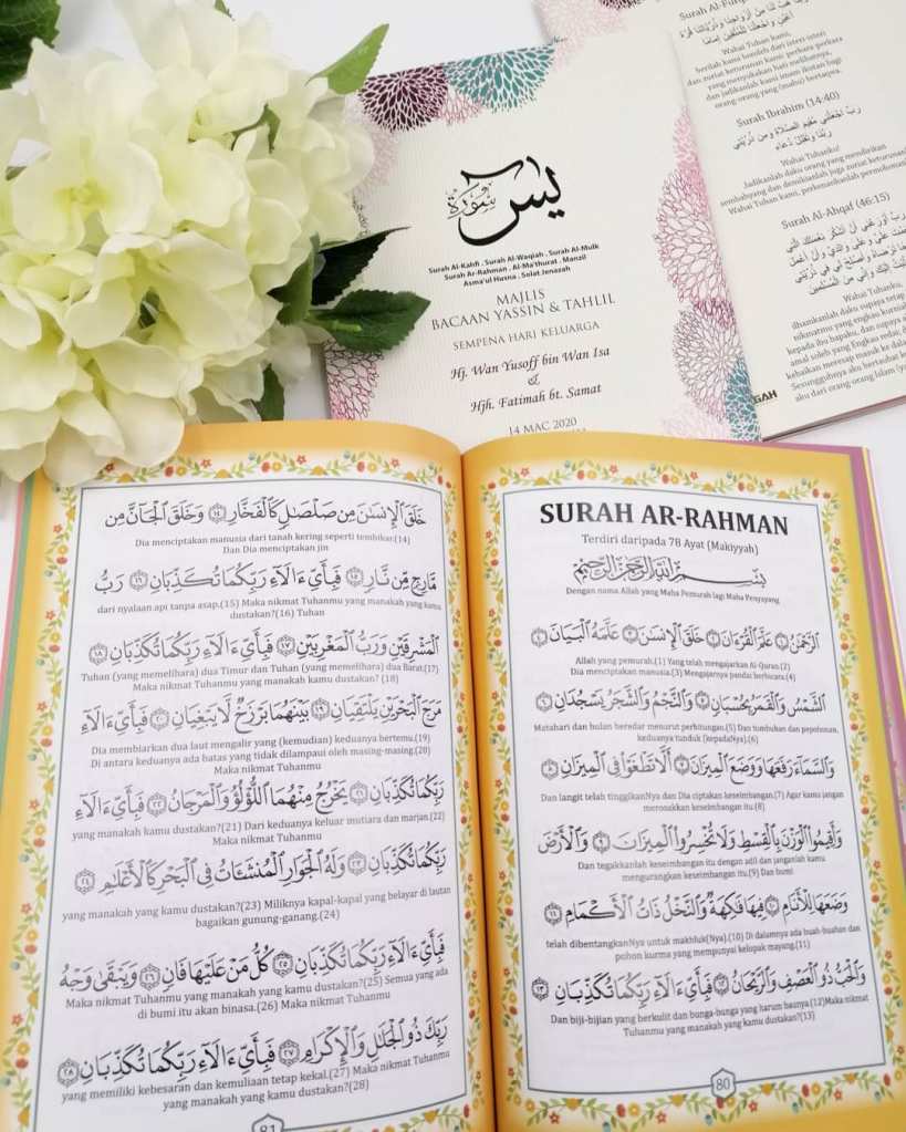 Buku yasin custom kami mengunakan cover artcard dan mempunyai 136 muka surat. Cover buku yasin kami custom dengan nama dan wording yang anda pilih serta mempunyai lebih dari 500 design untuk anda membuat pilihan. Kami jugak mengambil tempahan urgent untuk anda yang memerlukan dengan kadar segera.