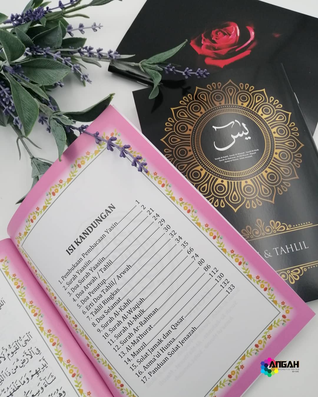 Untuk tempahan buku yasin custom, anda boleh terus click di sini atau whatsapp kami di 0192520041, atau terus ke showroom kami dengan waze: Angah Doorgift And Printing Sdn Bhd.