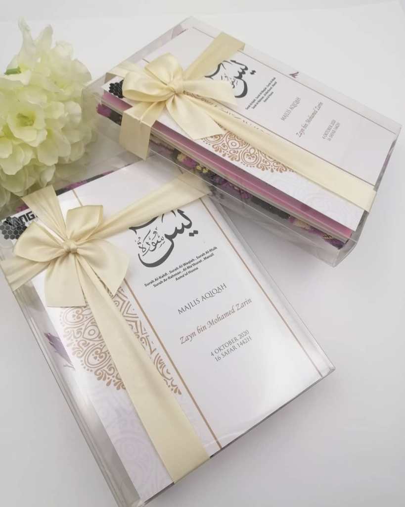 Kami berharap agar anda berpuas hati dengan servis yang tempahan yasin custom cover berikan. Buku yasin custom kami dilengkapi dengan Surah Yasin, Surah Al-Kahfi, Surah Al-Waqiah, Surah Al-Mulk, Surah Ar-Rahman, Al-Mathurat, Manzil, Asma’ul Husna, Solat Jenazah, Panduan Solat Jenazah dan pelbagai lagi content yang bermanfaat buat amalan harian anda. Kami mempunyai lebih 500 pilihan design yang pasti akan memuaskan hati anda semua.
