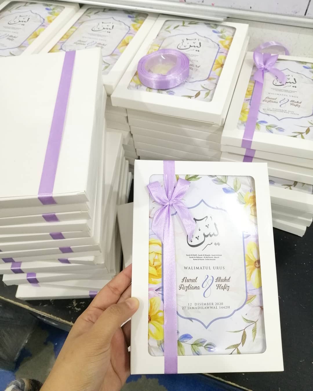 Buku yasin custom kami mengunakan cover artcard dan mempunyai 3 size berbeza iaitu Yasin Medium, Yasin Big dan Yasin Half A4. Cover buku yasin kami custom dengan nama dan wording yang anda pilih serta mempunyai lebih dari 500 design untuk anda membuat pilihan. Kami jugak mengambil tempahan urgent untuk anda yang memerlukan buku yasin custom dengan kadar segera.Untuk tempahan terus whatsapp team kami di 019-252 0041 atau terus ke showroom kami dengan waze: angah doorgift and printing sdn bhd.