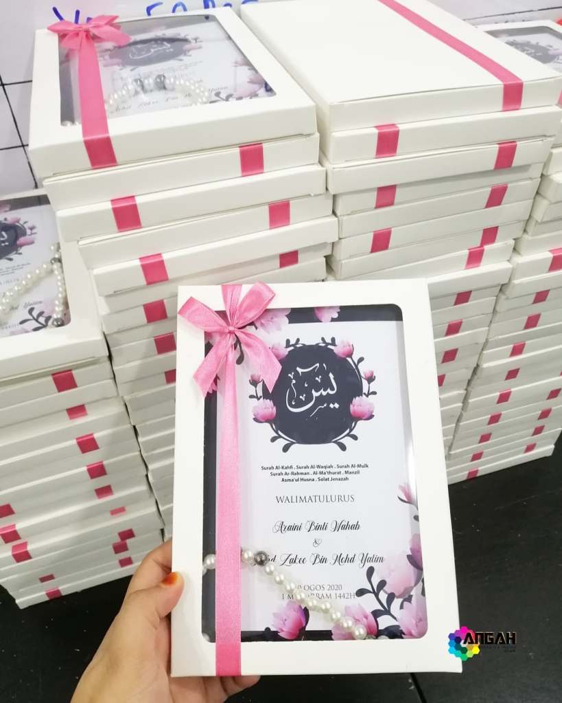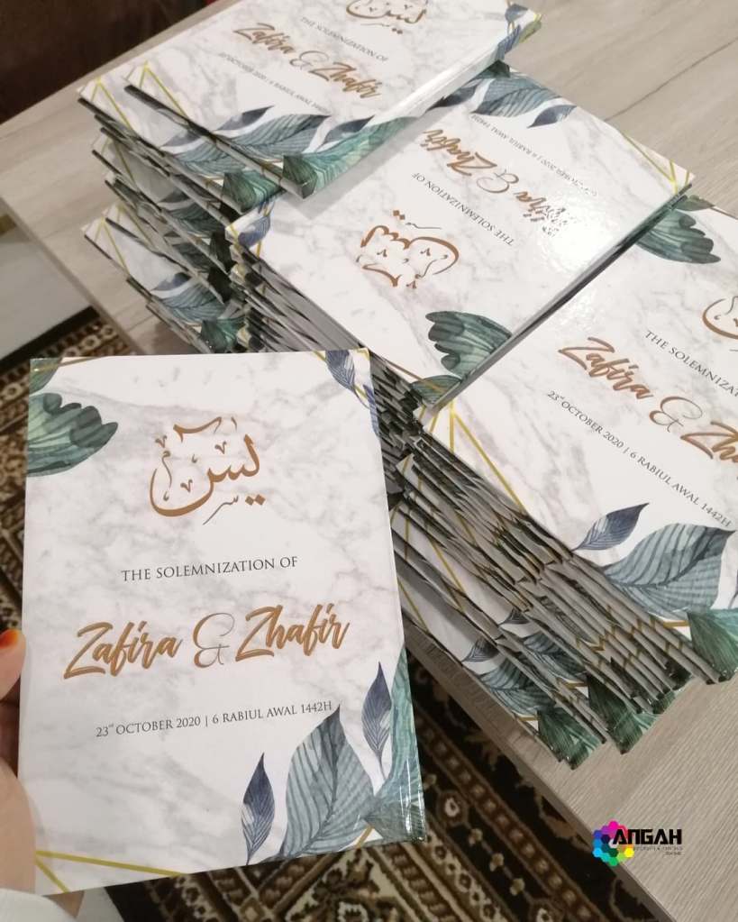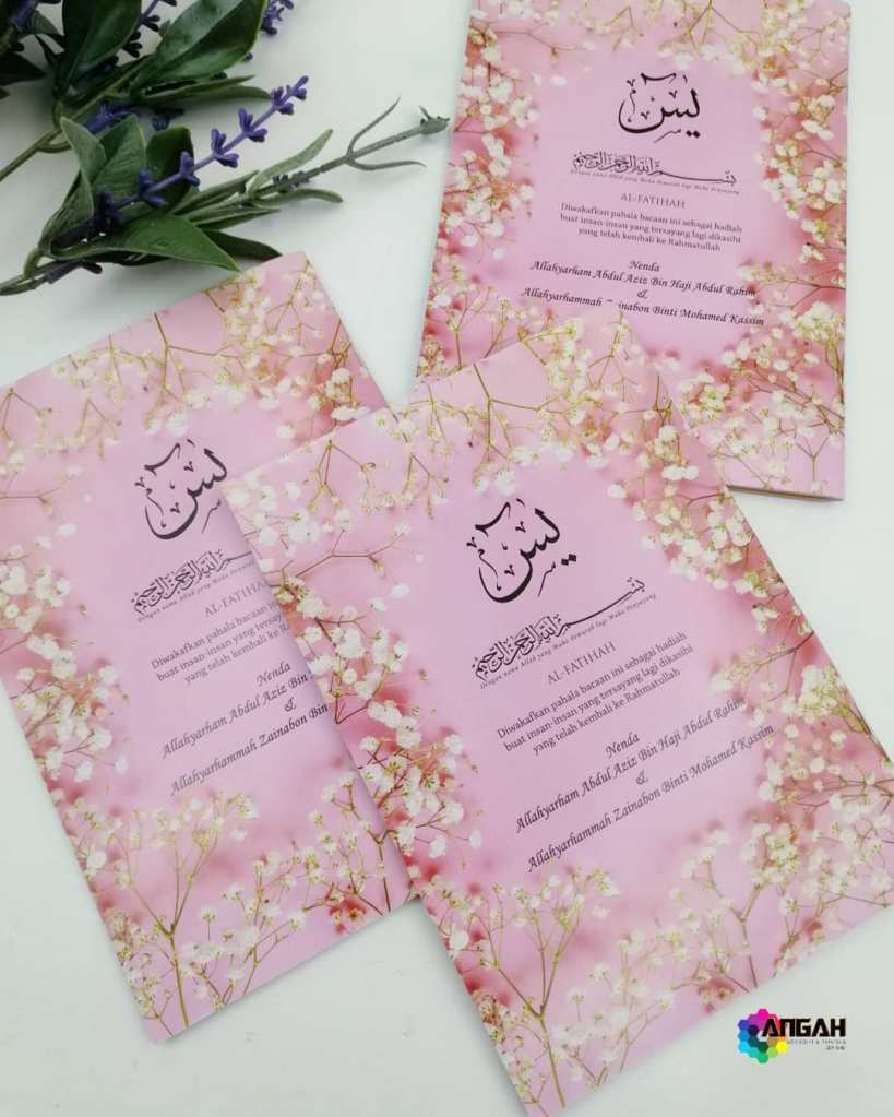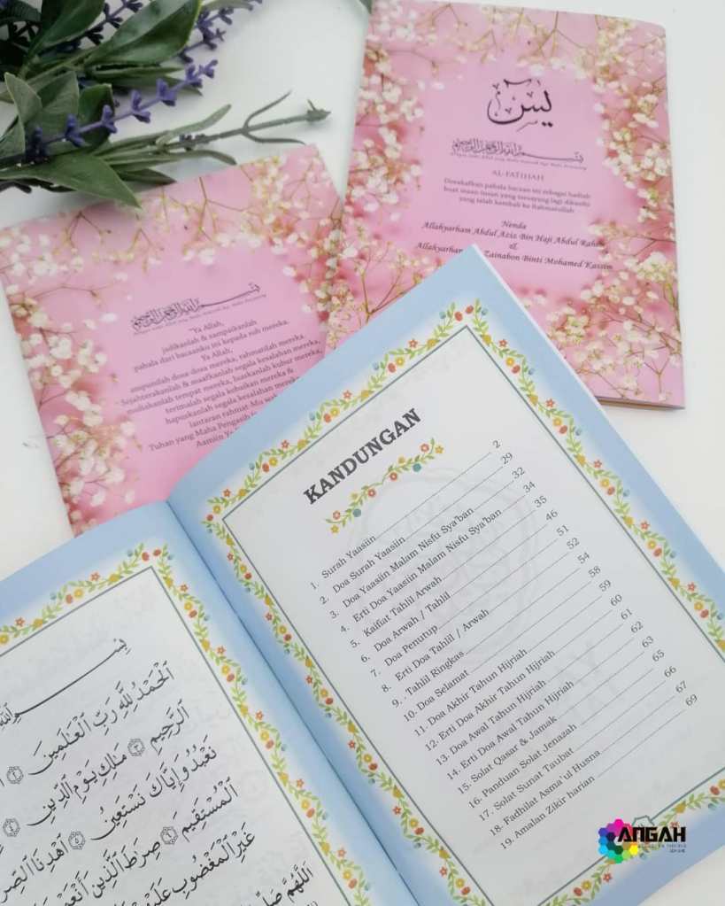 Kalau dah buat majlis perkahwinan, majlis aqiqah, majlis kesyukuran, majlis cukur jambul takkan nak beri doorgift biasa-biasa kan? Mestilah nak yang cantik & berkat supaya majlis pun berjalan dengan lancar DAN yang paling penting tetamu tak buang-buang doorgift tu kan 😉 Tempahan yassin, stiker & TQ tag ada menyediakan yasin untuk dijadikan doorgift ketika majlis anda. Apa yang lagi Istimewa? Terdapat 2 jenis Buku Yasin berserta tafsir Bahasa Melayu/English sebagai rujukan. Terdapat lebih 300 design untuk dipilih. Isi kandungan buku yasin berwarna. ‘Font’ nama dan perkataan mengikut kehendak anda. Yasin ada size besar dan sederhana. Layout yang kemas dengan tulisan yang jelas. Terdapat Tahlil, Doa Arwah, Doa Selamat, Doa Penutup, Asmaul Husna, Zikir Hardan dan lain-lain.Untuk tempahan buku yasin custom, anda boleh terus click di sini or whatsapp kami 0192520041, atau terus ke showroom kami dengan waze: Angah Doorgift And Printing Sdn Bhd