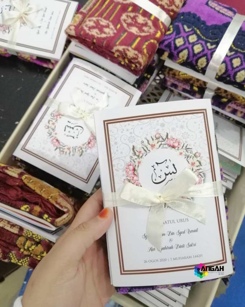 Kalau dah buat majlis perkahwinan, majlis aqiqah, majlis kesyukuran, majlis cukur jambul takkan nak beri doorgift biasa-biasa kan? Mestilah nak yang cantik & berkat supaya majlis pun berjalan dengan lancar DAN yang paling penting tetamu tak buang-buang doorgift tu kan 😉 Tempahan yassin, stiker & TQ tag ada menyediakan yasin untuk dijadikan doorgift ketika majlis anda. Apa yang lagi Istimewa? Terdapat 2 jenis Buku Yasin berserta tafsir Bahasa Melayu/English sebagai rujukan. Terdapat lebih 300 design untuk dipilih. Isi kandungan buku yasin berwarna. ‘Font’ nama dan perkataan mengikut kehendak anda. Yasin ada size besar dan sederhana. Layout yang kemas dengan tulisan yang jelas. Terdapat Tahlil, Doa Arwah, Doa Selamat, Doa Penutup, Asmaul Husna, Zikir Hardan dan lain-lain.Untuk tempahan buku yasin custom, anda boleh terus click di sini or whatsapp kami 0192520041, atau terus ke showroom kami dengan waze: Angah Doorgift And Printing Sdn Bhd.