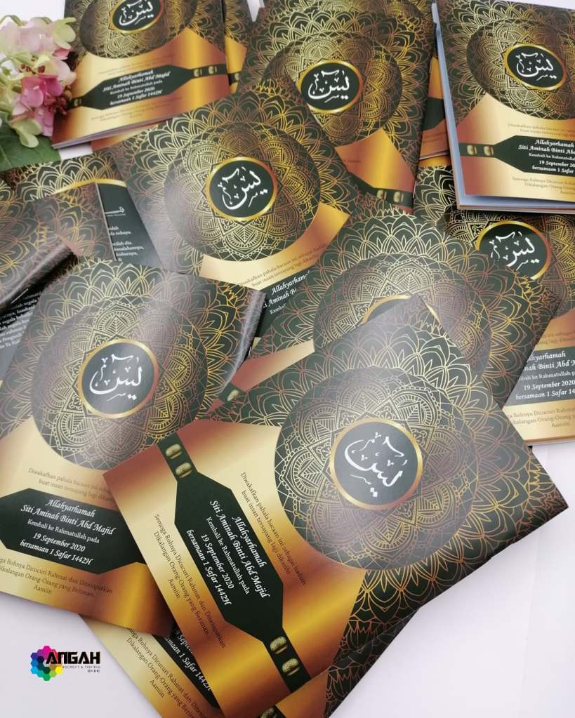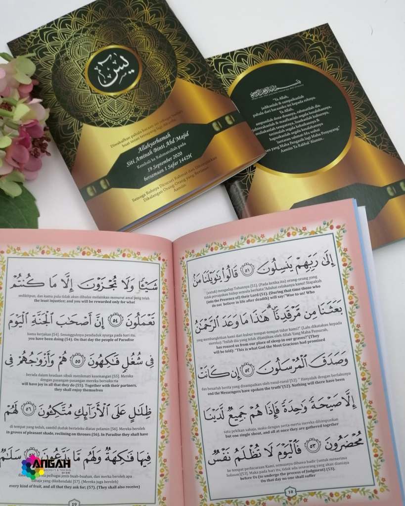 Kalau dah buat majlis perkahwinan, majlis aqiqah, majlis kesyukuran, majlis cukur jambul takkan nak beri doorgift biasa-biasa kan? Mestilah nak yang cantik & berkat supaya majlis pun berjalan dengan lancar DAN yang paling penting tetamu tak buang-buang doorgift tu kan 😉 Tempahan yassin, stiker & TQ tag ada menyediakan yasin untuk dijadikan doorgift ketika majlis anda. Apa yang lagi Istimewa? Terdapat 2 jenis Buku Yasin berserta tafsir Bahasa Melayu/English sebagai rujukan. Terdapat lebih 300 design untuk dipilih. Isi kandungan buku yasin berwarna. ‘Font’ nama dan perkataan mengikut kehendak anda. Yasin ada size besar dan sederhana. Layout yang kemas dengan tulisan yang jelas. Terdapat Tahlil, Doa Arwah, Doa Selamat, Doa Penutup, Asmaul Husna, Zikir Hardan dan lain-lain.Untuk tempahan buku yasin custom, anda boleh terus click di sini or whatsapp kami 0192520041, atau terus ke showroom kami dengan waze: Angah Doorgift And Printing Sdn Bhd
