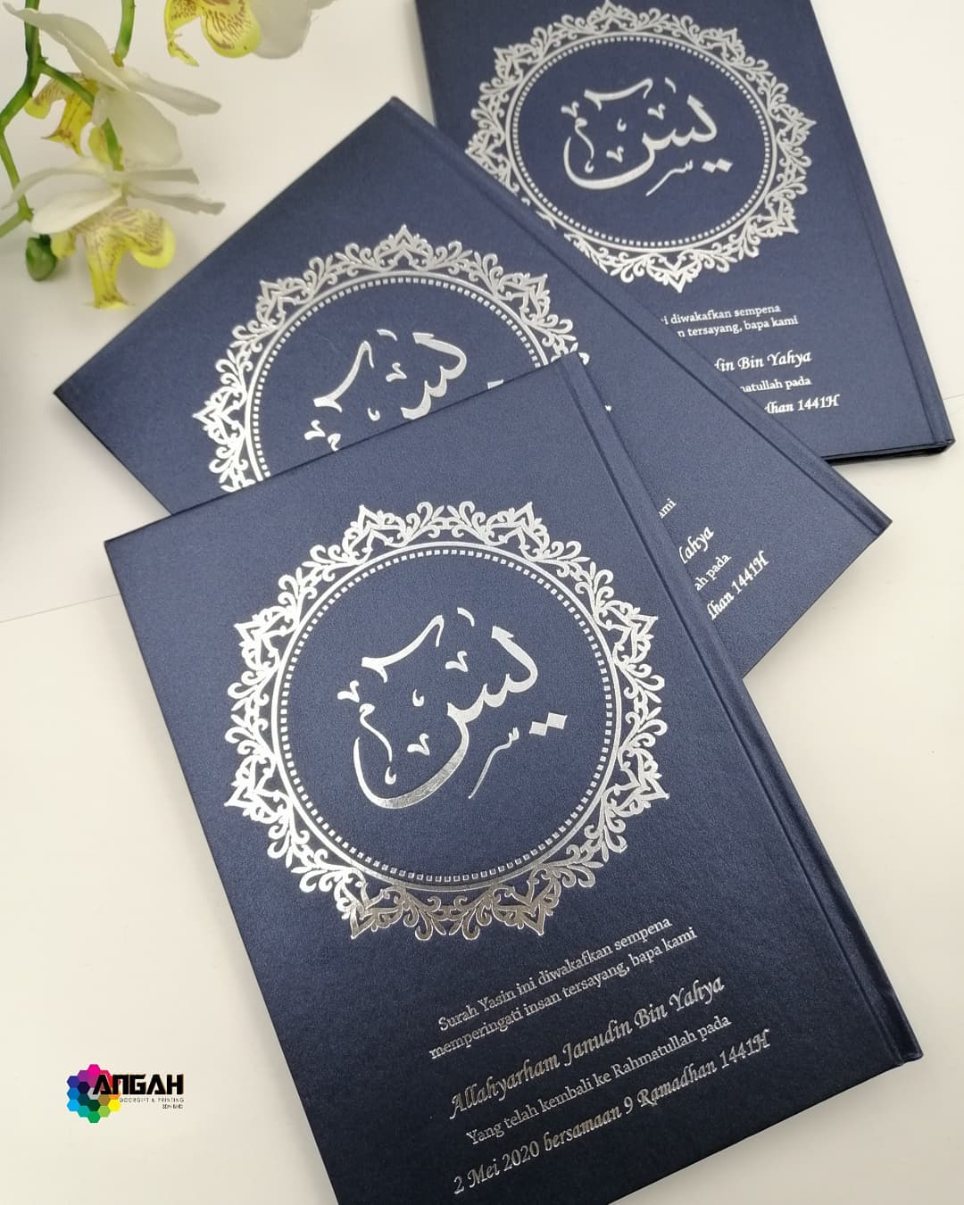 Kami berharap agar anda berpuas hati dengan servis yang tempahan yasin custom cover berikan. Buku yasin custom kami dilengkapi dengan Surah Yasin, Surah Al-Kahfi, Surah Al-Waqiah, Surah Al-Mulk, Surah Ar-Rahman, Al-Mathurat, Manzil, Asma’ul Husna, Solat Jenazah, Panduan Solat Jenazah dan pelbagai lagi content yang bermanfaat buat amalan harian anda. Kami mempunyai lebih 500 pilihan design yang pasti akan memuaskan hati anda semua.Untuk tempahan buku yasin custom, anda boleh terus click di sini atau whatsapp kami di 0192520041, atau terus ke showroom kami dengan waze: Angah Doorgift And Printing Sdn Bhd.