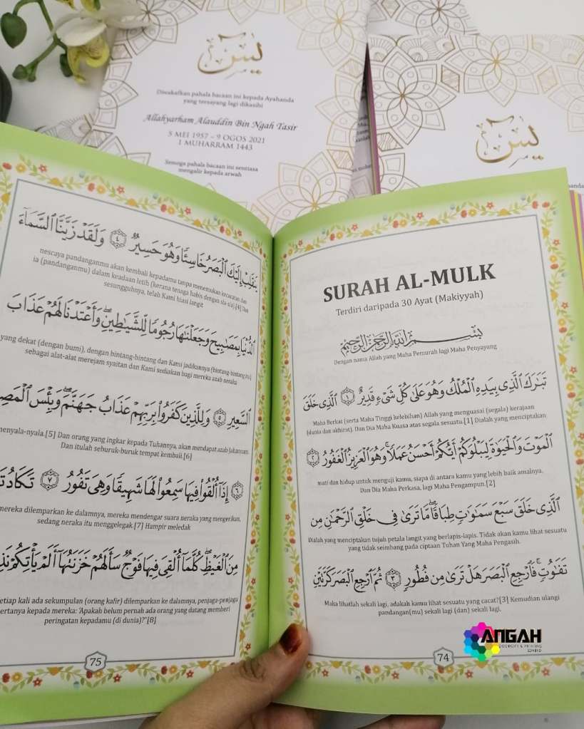 Untuk tempahan buku yasin custom, anda boleh terus click di sini atau whatsapp kami di 0192520041, atau terus ke showroom kami dengan waze: Angah Doorgift And Printing Sdn Bhd.