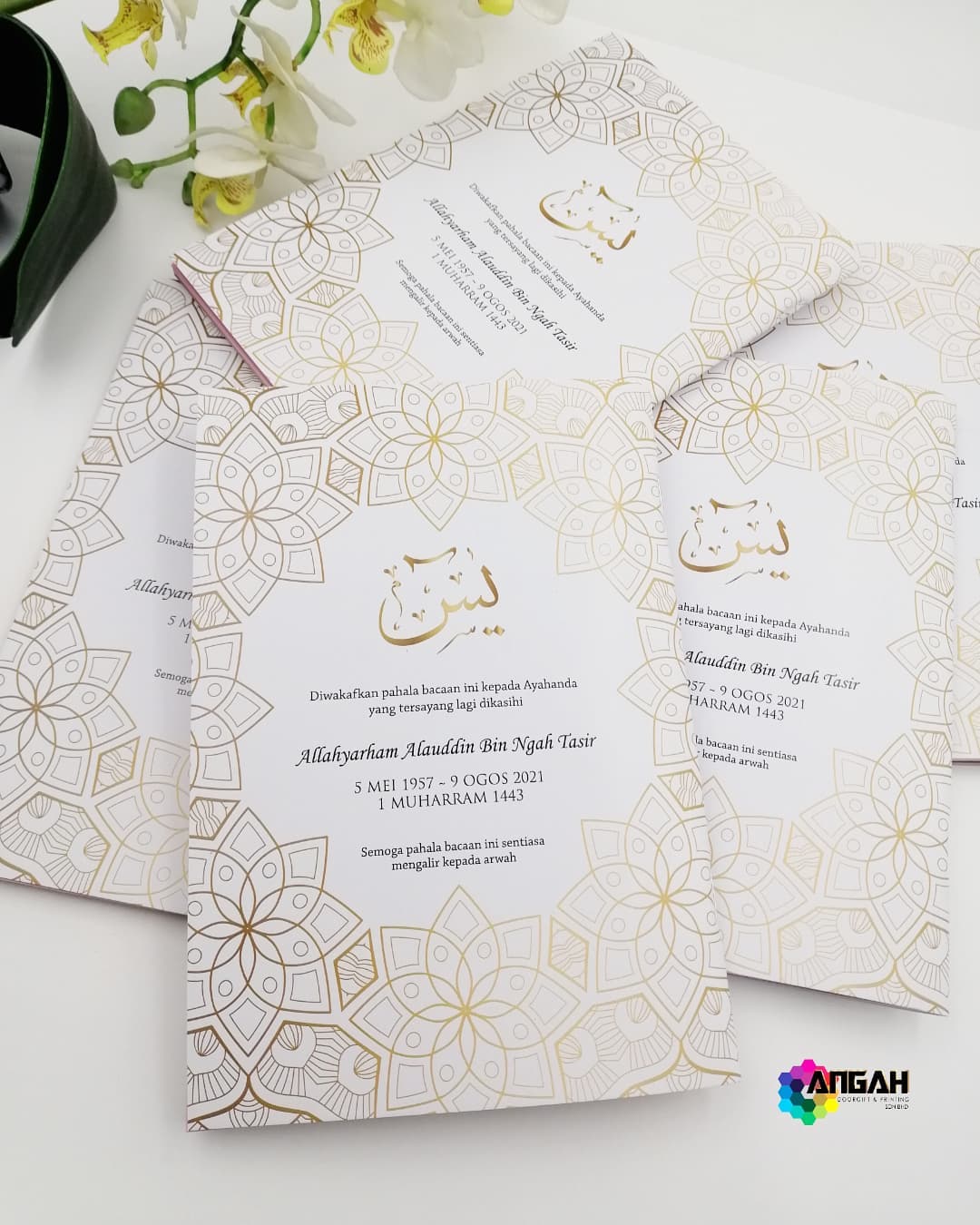 Untuk tempahan buku yasin custom, anda boleh terus click di sini atau whatsapp kami di 0192520041, atau terus ke showroom kami dengan waze: Angah Doorgift And Printing Sdn Bhd.