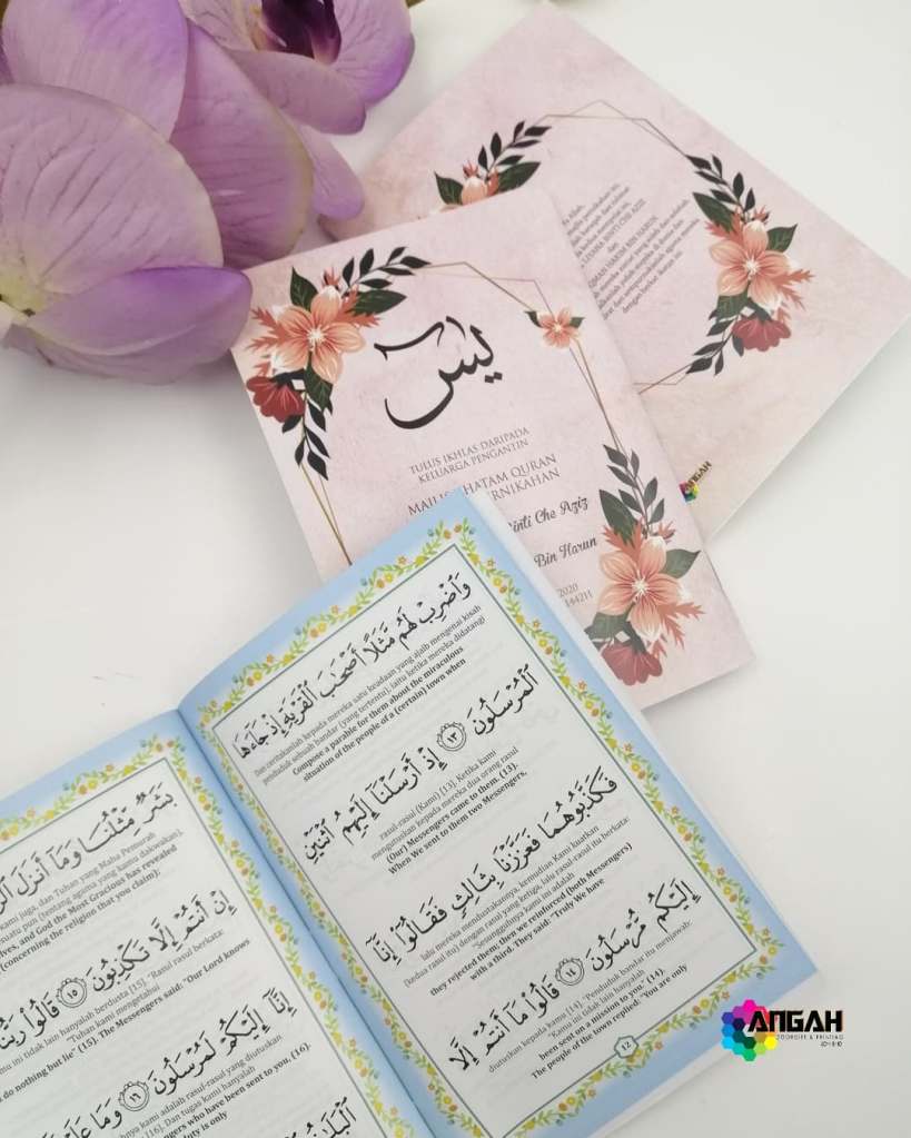 Untuk tempahan buku yasin custom, anda boleh terus click di sini atau whatsapp kami di 0192520041, atau terus ke showroom kami dengan waze: Angah Doorgift And Printing Sdn Bhd.