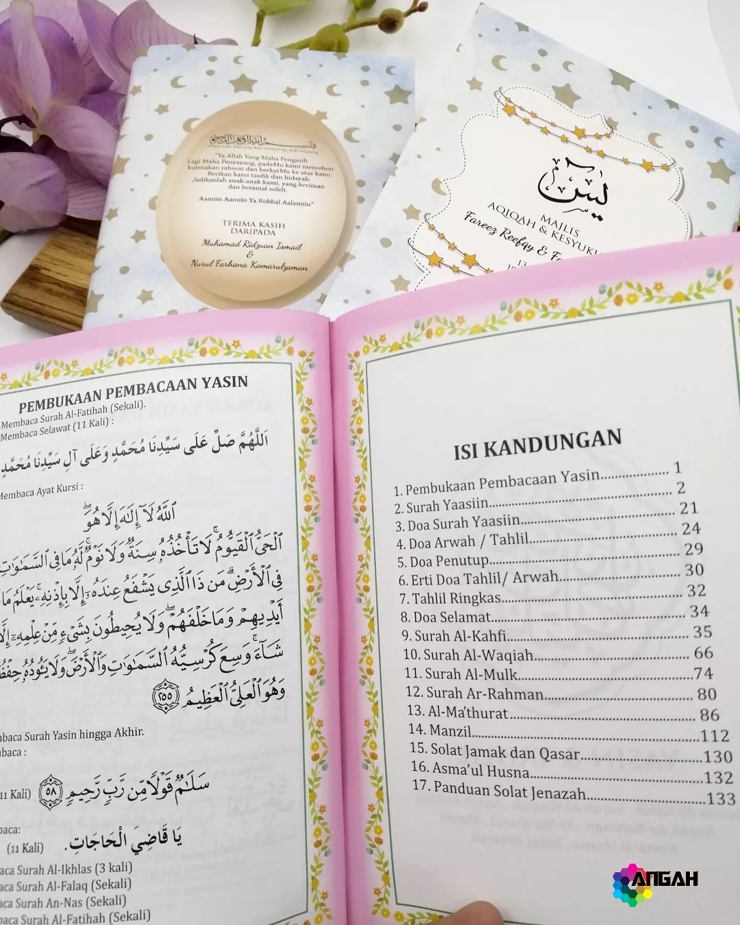 Jom Jadikan memori indah di MAJLIS AQIQAH & KESYUKURAN dengan kehadiran buku yasin custom cover sebagai buah tangan nanti.