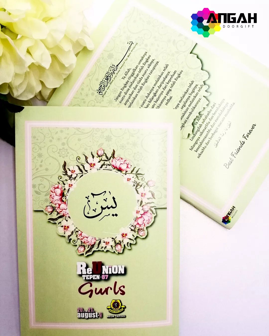 JOM sediakan sesuatu yang bermakna buat tetamu. Majlis Reunion MRSM Taiping, Perak dengan sahabat-sahabat tersayang. Semoga majlis perjumpaan mereka berjalan lancar & berseri dengan gift buku yasin cutom cover.