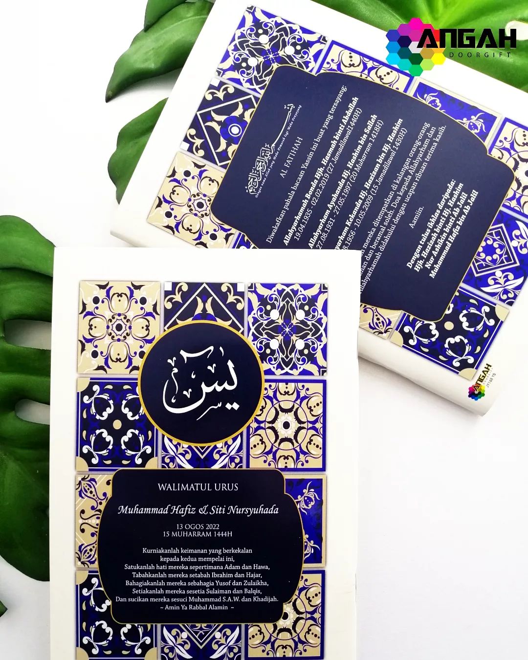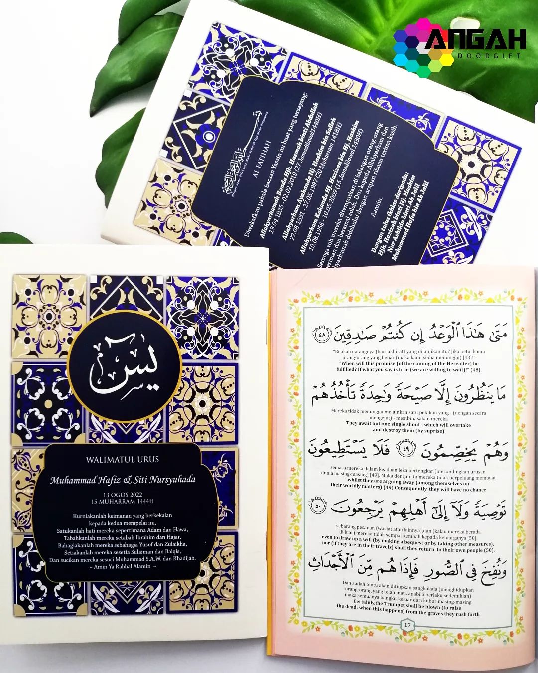 Pada cover yasin kami print nama arwah, tarikh, doa dan wording pilihan mengikut permintaan anda.