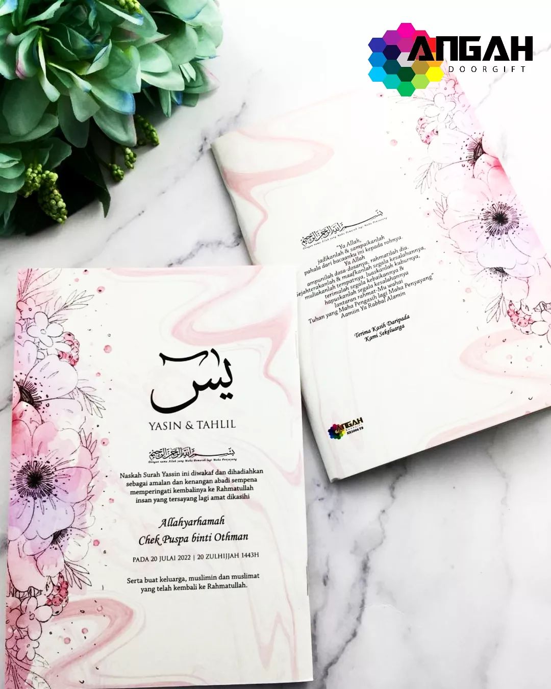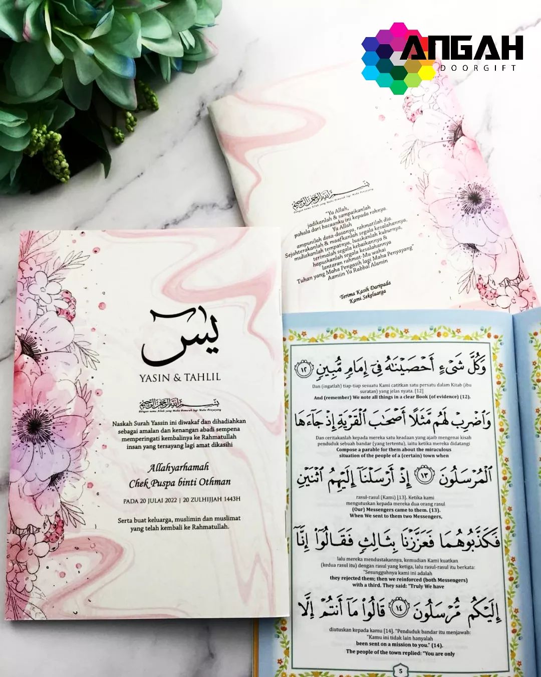 Pada cover yasin kami print nama arwah, tarikh, doa dan wording pilihan mengikut permintaan anda.