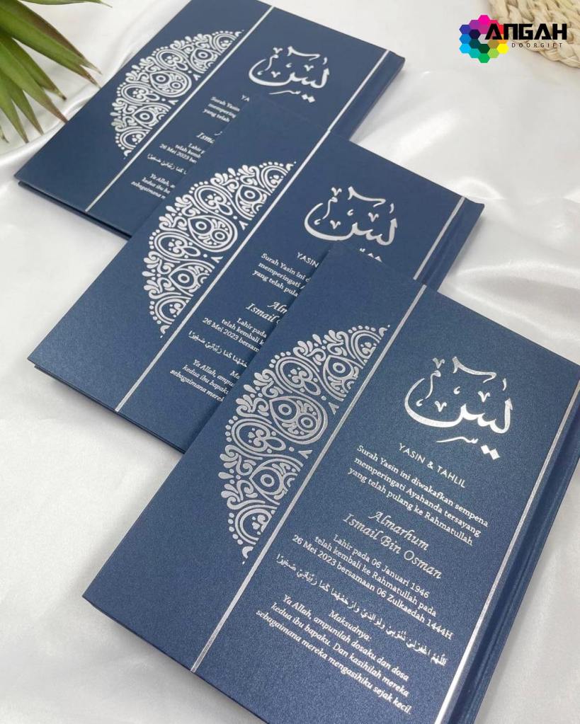 Yasin custom cover jenis ini dilengkapi dengan hotstamping silver. Hasilnya sangat exclusive dan anda boleh hotstamping nama arwah pada kulit buku yasin. Tentu dengan cara ini akan lebih ramai lagi yang mendoakan arwah yang telah lama pergi buat selamanya.