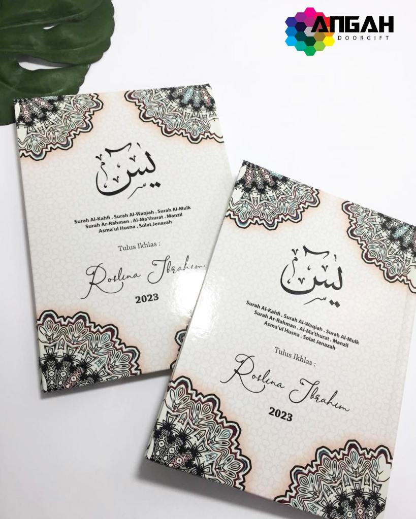 Buku yasin custom cover ini bukan sahaja untuk majlis tahlil bahkan sesuai juga dijadikan sebagai hadiah buat kenalan anda yang sudah bersara, buku yasin ini sangat banyak manfaatnya, jenis pelanggan kami tempah ini adalah yasin Hardcover Full Printing, anda boleh pilih design mengikut citarasa anda sendiri.
