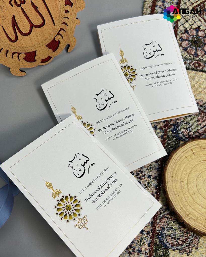 Tentu ada dikalangan ibu ayah yang baru saja menimang cahaya mata kan? Nak buat majlis aqiqah untuk anak tapi masih tidak tahu doorgift yang sesuai untuk beri pada tetamu? Kami ada buku yasin custom cover untuk ibu ayah jadikan doorgift. Boleh tulis nama cahaya mata anda dan letak gambar sekali tau.