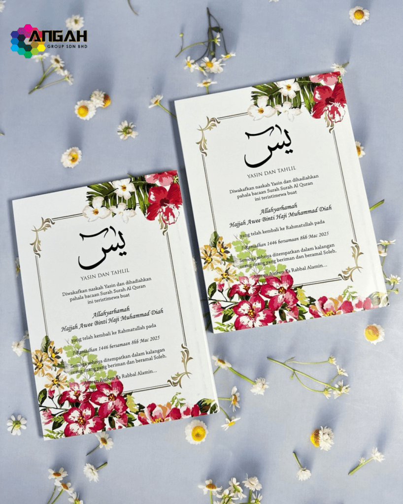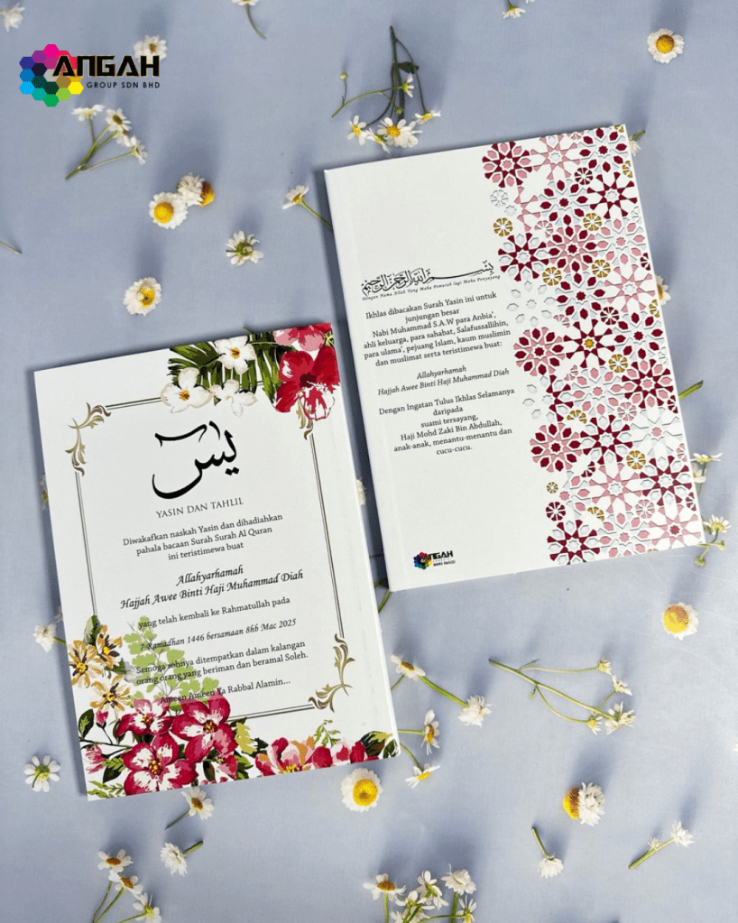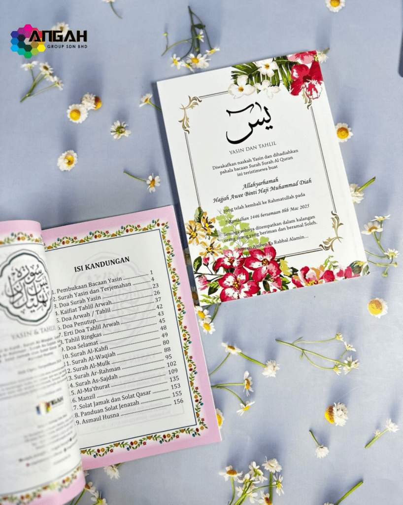 Buku Yasin ini sesuai untuk wakaf di surau, masjid, majlis tahlil, atau sedekah umum. Dengan reka bentuk yang kemas dan elegan, serta nama insan tersayang boleh dicetak khas di muka hadapan, ia menjadikan amal jariah ini lebih personal dan menyentuh hati.