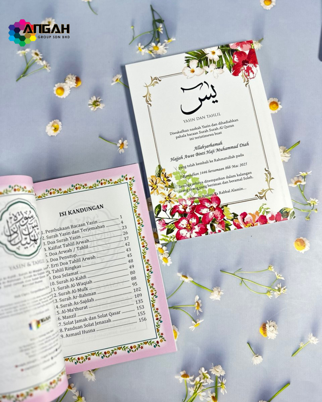 Buku Yasin ini sesuai untuk wakaf di surau, masjid, majlis tahlil, atau sedekah umum. Dengan reka bentuk yang kemas dan elegan, serta nama insan tersayang boleh dicetak khas di muka hadapan, ia menjadikan amal jariah ini lebih personal dan menyentuh hati.