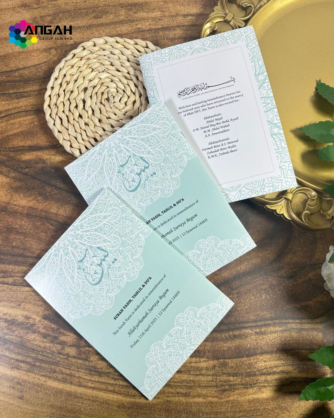 Direka kemas dengan material berkualiti, sesuai untuk majlis tahlil, kenduri arwah atau sebagai wakaf. Setiap naskhah bukan sekadar bacaan, tapi kenangan yang boleh disimpan selamanya.