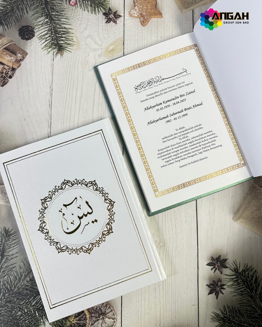 Setiap buku boleh dicustom dengan nama, doa, atau doa khas. Reka bentuk kulit dan warna juga boleh disesuaikan mengikut tema majlis, menjadikannya lebih bermakna dan penuh nilai sentimental.