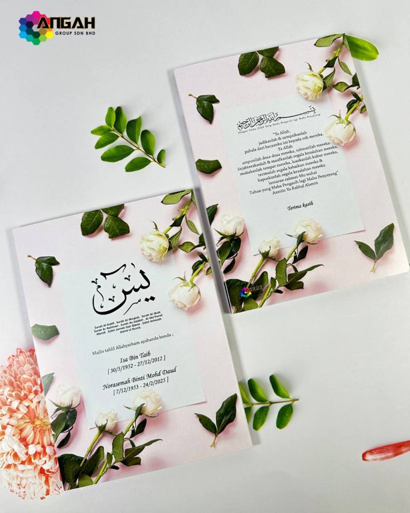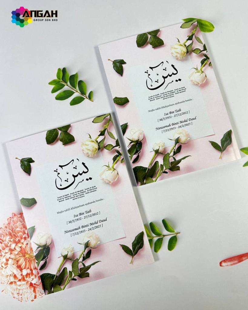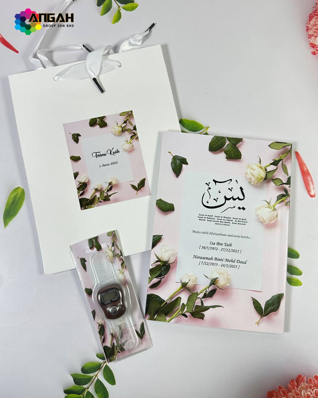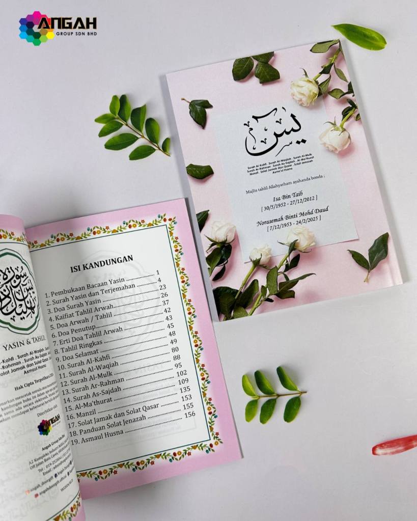 Buku Yasin custom untuk majlis tahlil adalah cenderahati bermakna, lengkap dengan nama arwah dan tarikh majlis, sebagai tanda ingatan penuh doa.