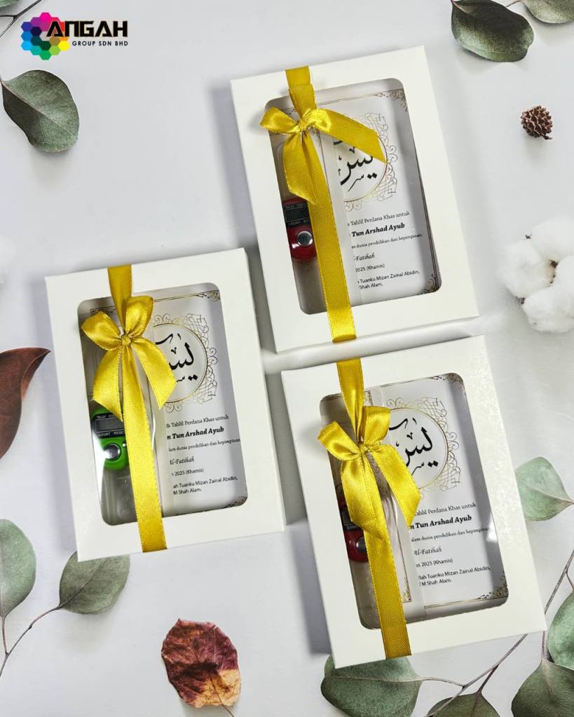 Pilihan cenderahati yang eksklusif dan bermakna untuk majlis tahlil, doa selamat atau aqiqah. Ia lengkap dengan Buku Yasin yang mudah dibaca, tasbih digital, dan dihias dengan riben elegan.