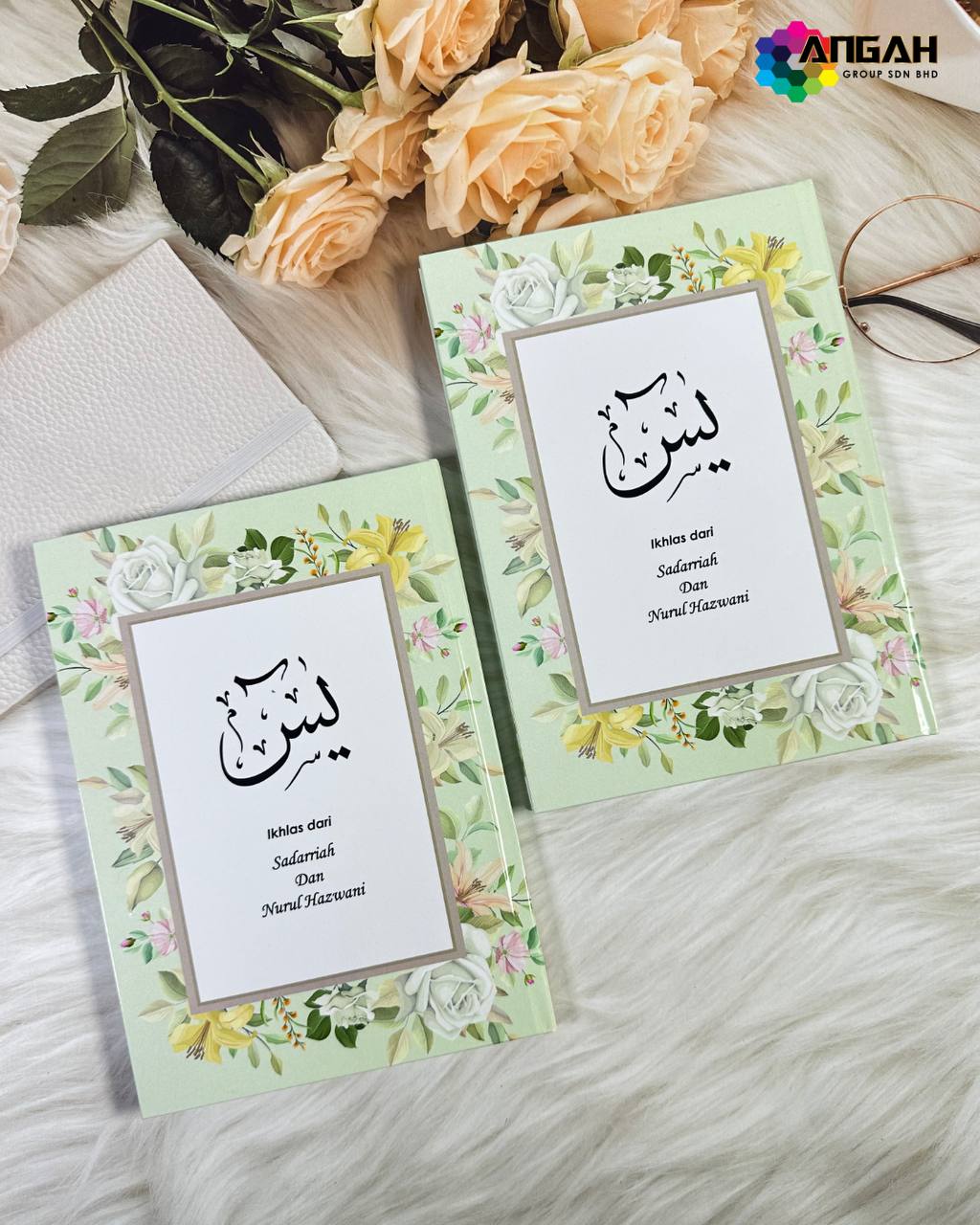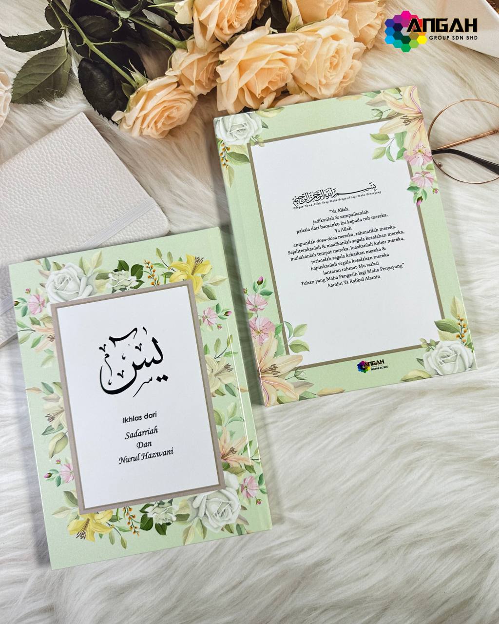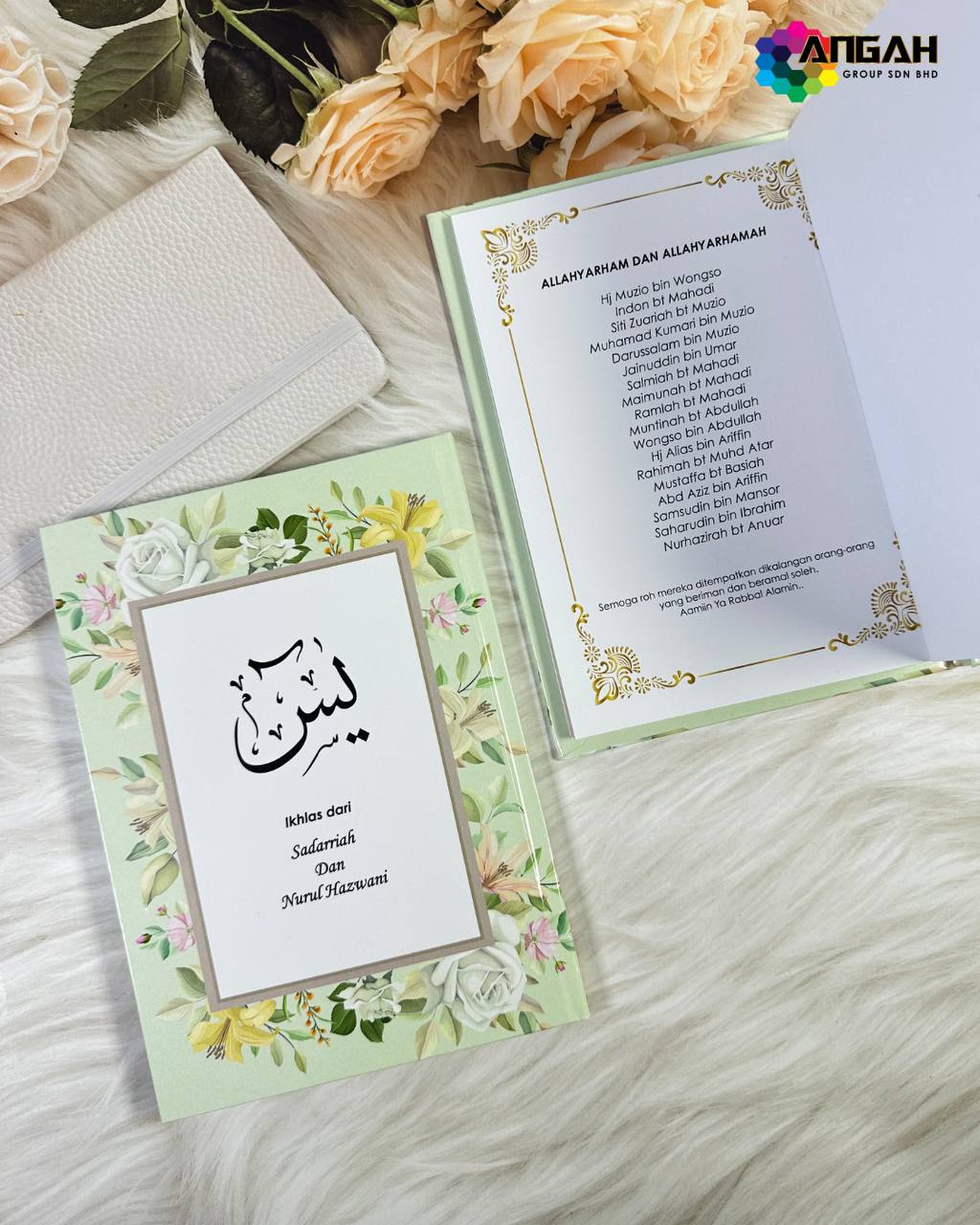 Buku Yasin ini boleh disertakan nama arwah, ucapan khas dan rekaan yang eksklusif – sesuai untuk tahlil, kenduri arwah atau wakaf.