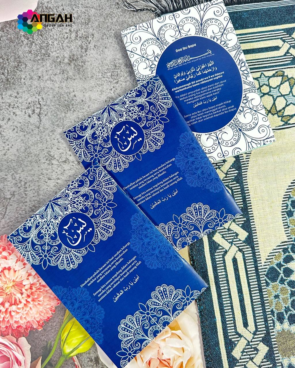 Tempah buku Yasin custom untuk sedekah jariah hari ini. Boleh letak nama arwah dan pilih design. Hubungi kami untuk buat tempahan di talian 0133377005.