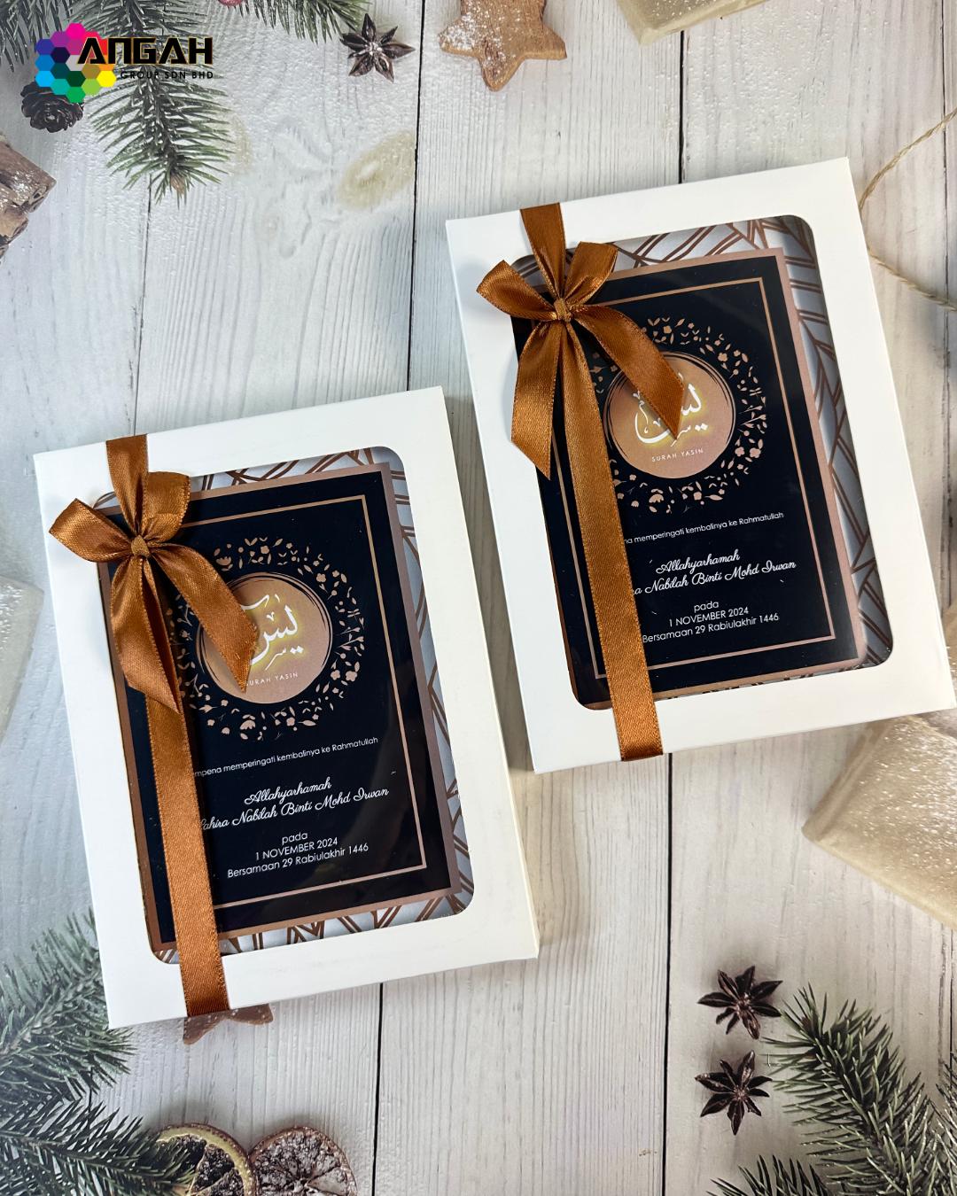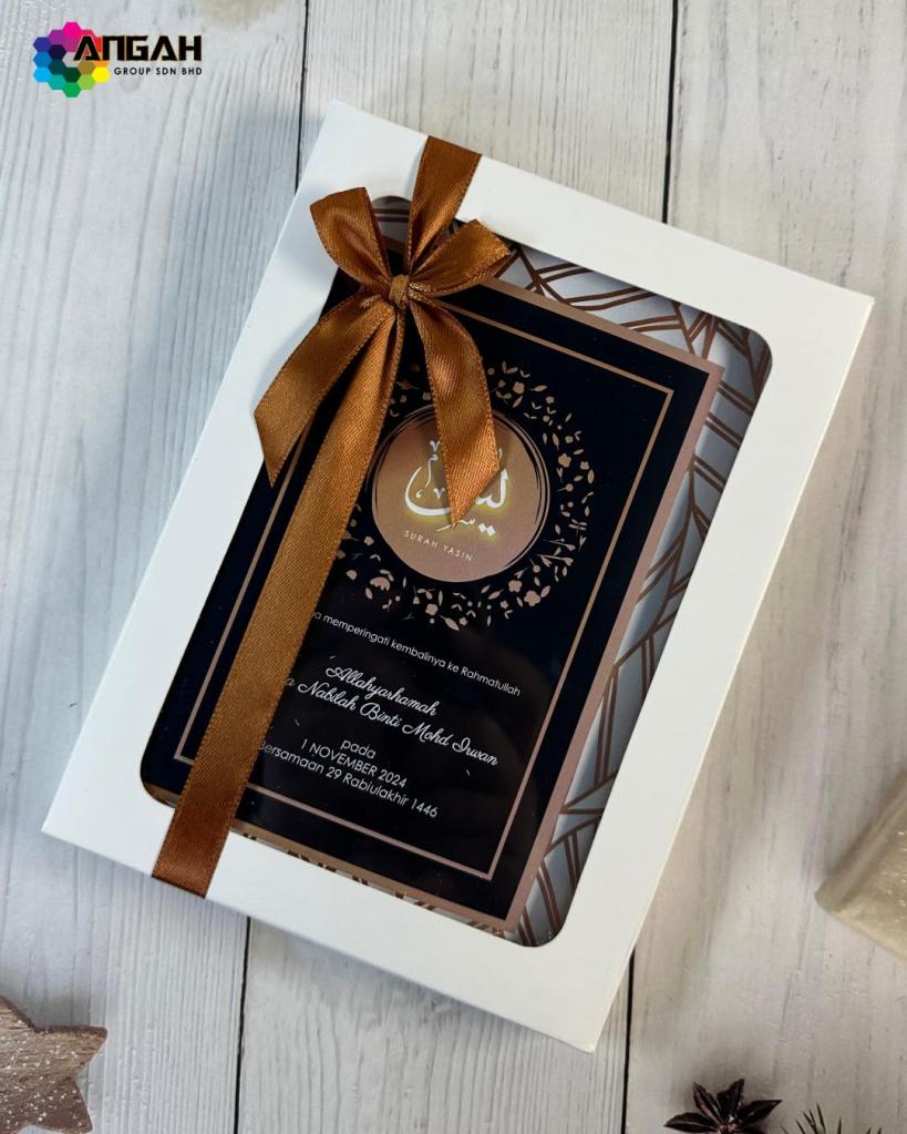 Set Kotak Buku Yasin + Riben ini tampil eksklusif dan penuh makna, sesuai untuk pelbagai majlis seperti tahlil, aqiqah atau perkahwinan.
